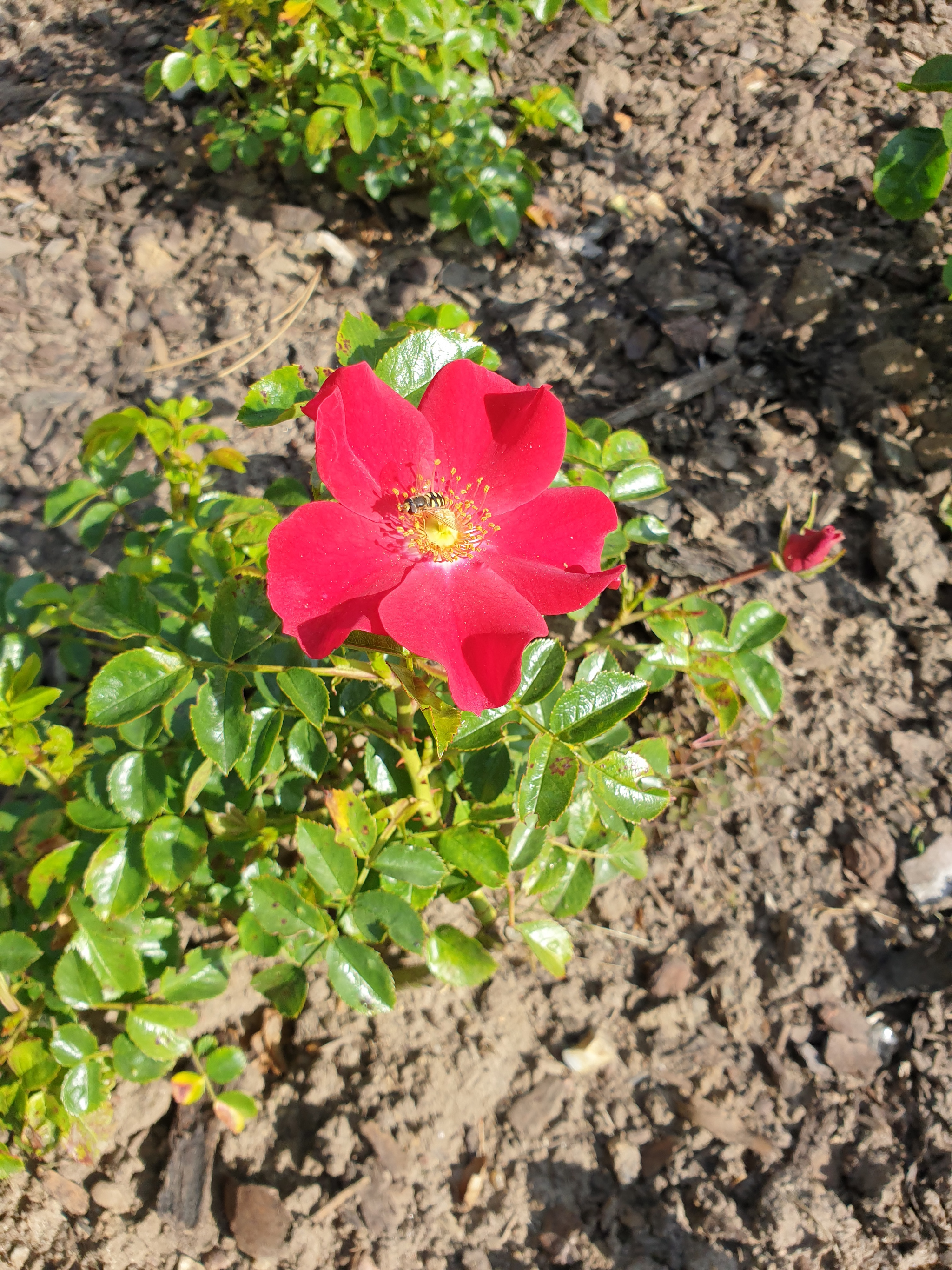 Au port buissonnant et rampant, fleurs rouges en coupe, aux étamines jaunes d’or, très haute résistance aux maladies, membre de la collection NectarGarden.