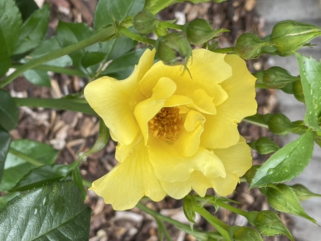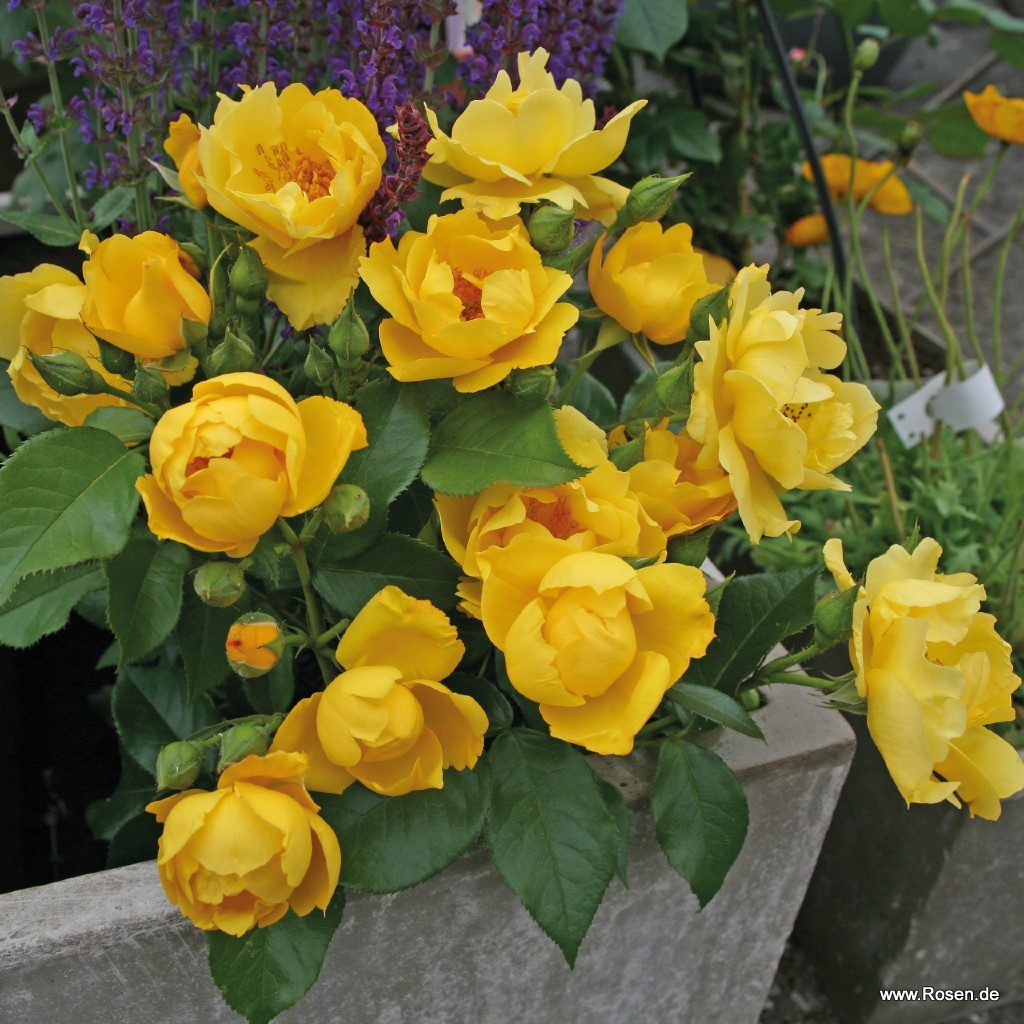 Petit rosier joyeux et sans soucis qui éclaire le massif dans lequel je l'ai planté. Dans ma roseraie écologique, où je marie des rosiers de différentes couleurs, j'associe souvent un rosier jaune et un rosier mauve. Les rosiers s'entendent bien ! /A cheerful, worry-free little rose that brightens up the bed in which I planted it. In my ecological rose garden, where I combine roses of different colours, I often combine a yellow rose with a mauve rose. Roses get on well together!