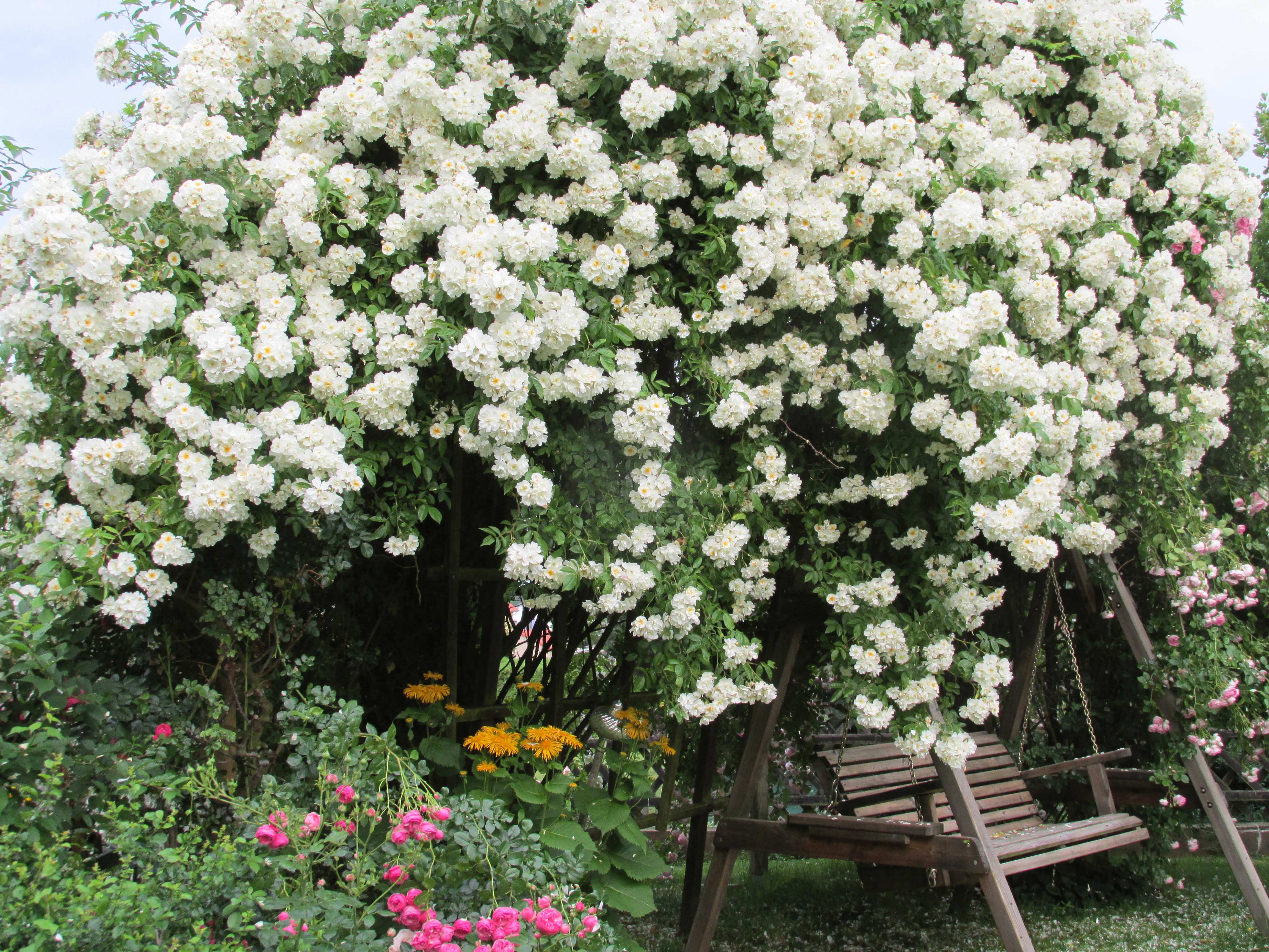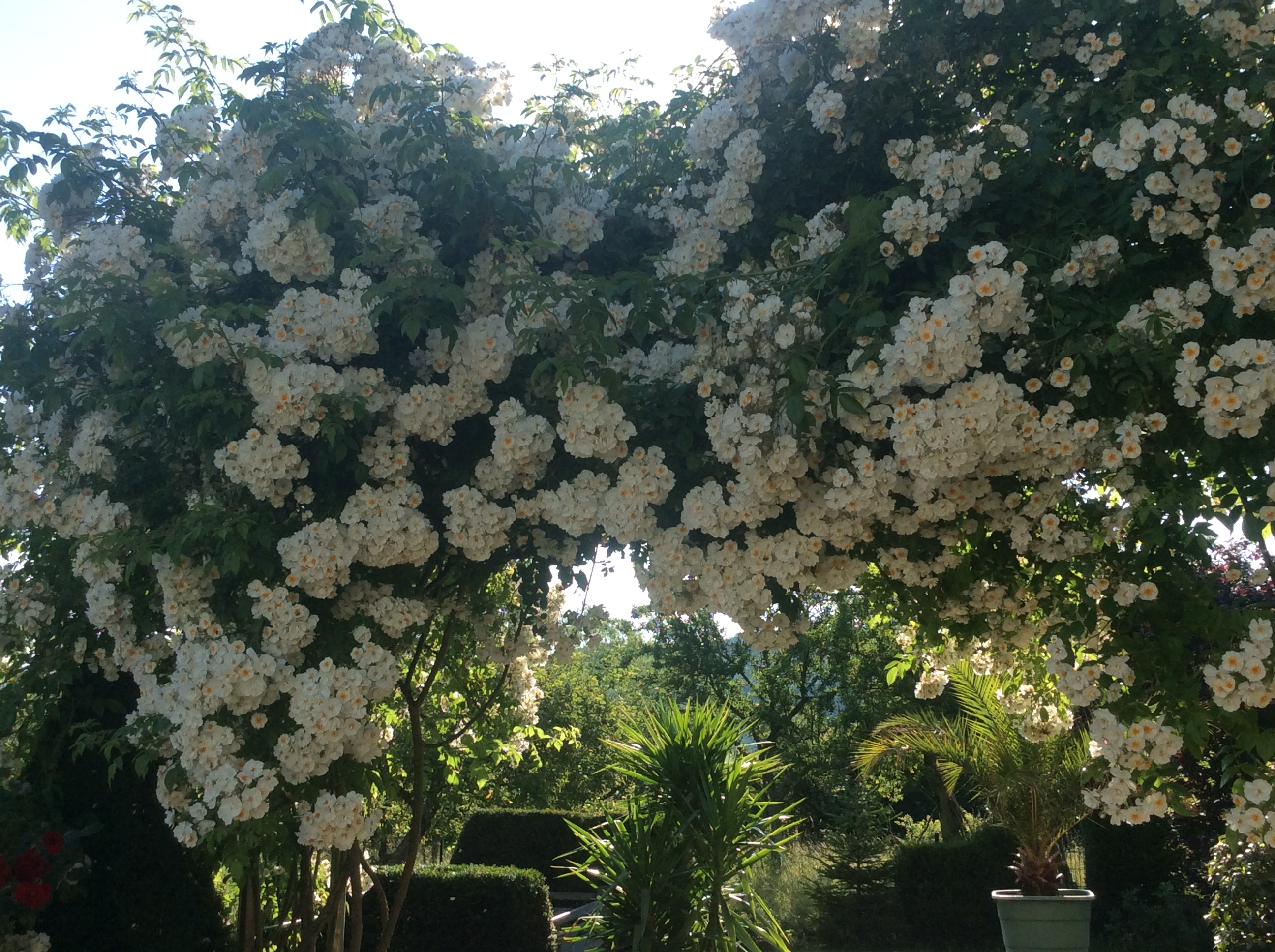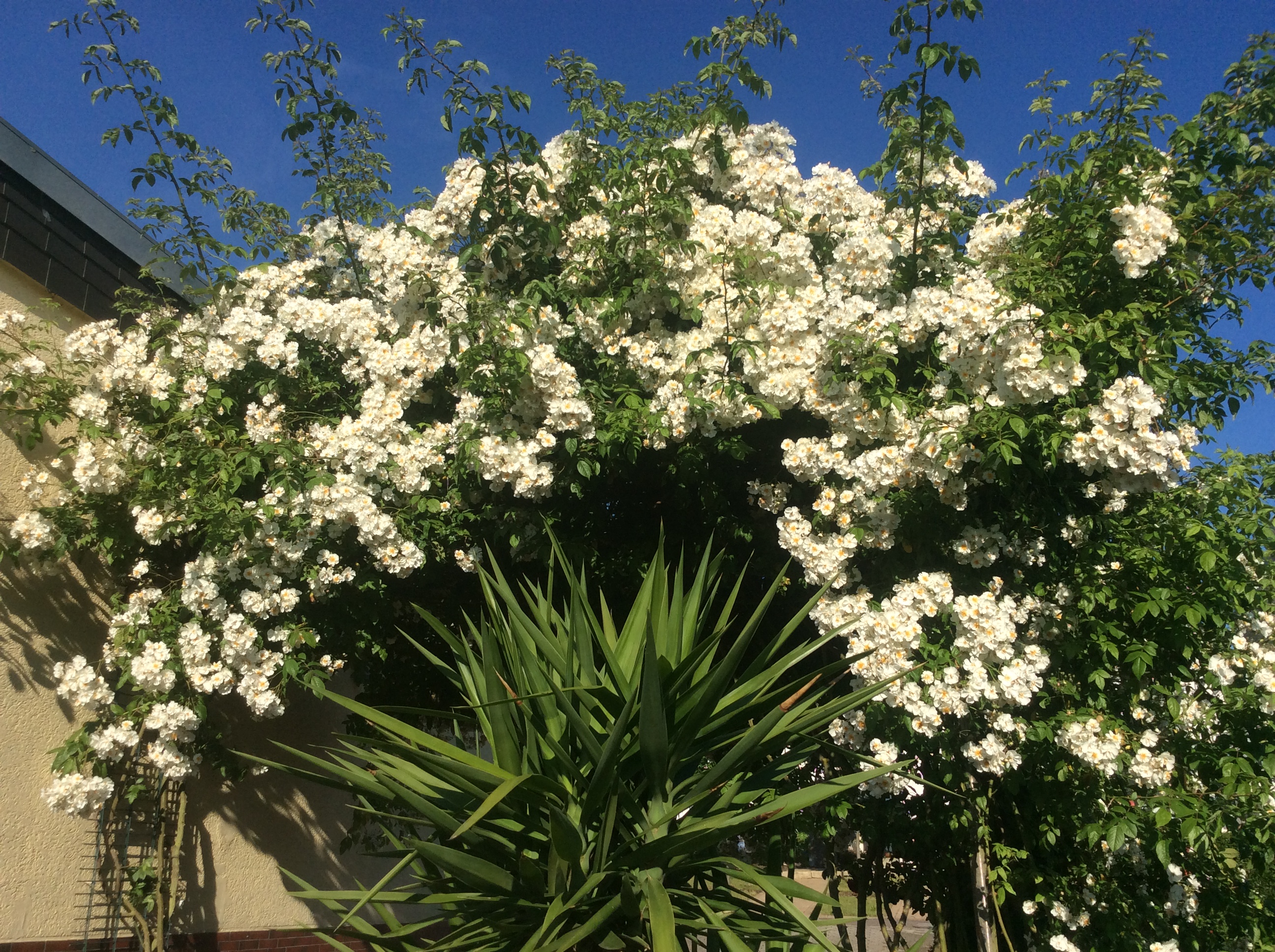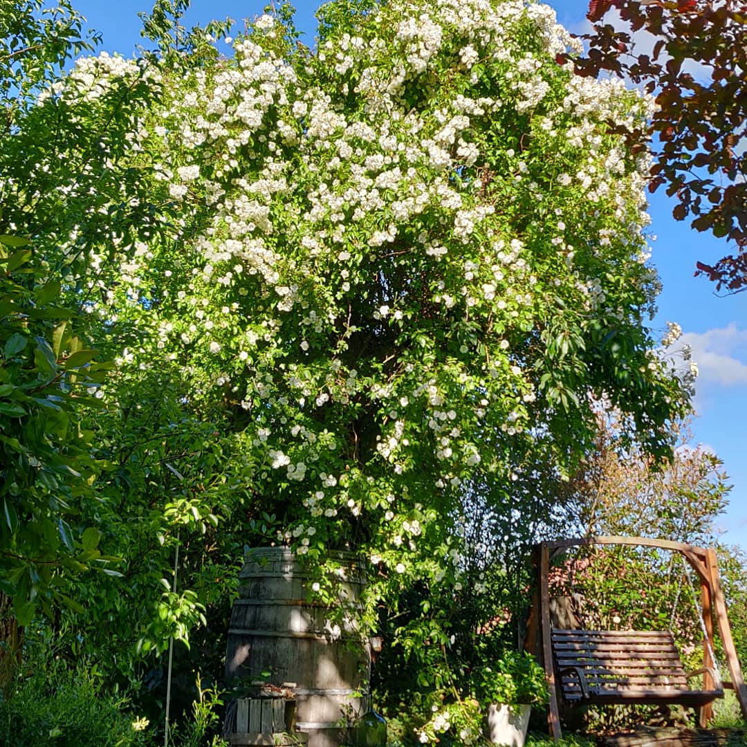 Die Rose habe ich am Fuß einer Kiefer gepflanzt und am Anfang am Stamm fest gebunden. Nachdem die Richtung klar war ist sie weiter nach oben geklettert und mittlerweile in 6 m Höhe angekommen. Von dort erobert sie langsam die benachbarte Birke. An verschiedenen Stellen hängen lange Zweige nach unten, und wenn sie blüht ist das ein malerisches Bild. Da ein Wanderweg am Garten vorbei führt, nehme ich an dass das schon auf so manchem Handy festgehalten wurde. Die etwas dunkle und 'langweilige' Kiefer ist durch die Rose sehr aufgewertet worden.