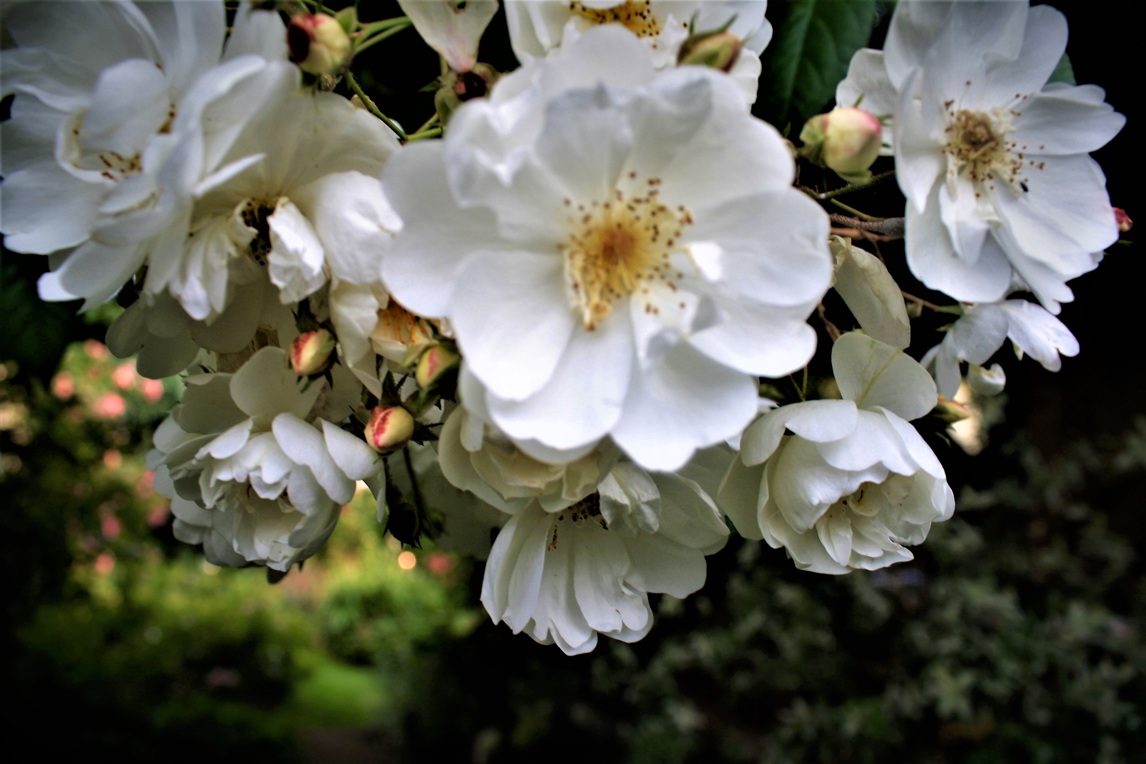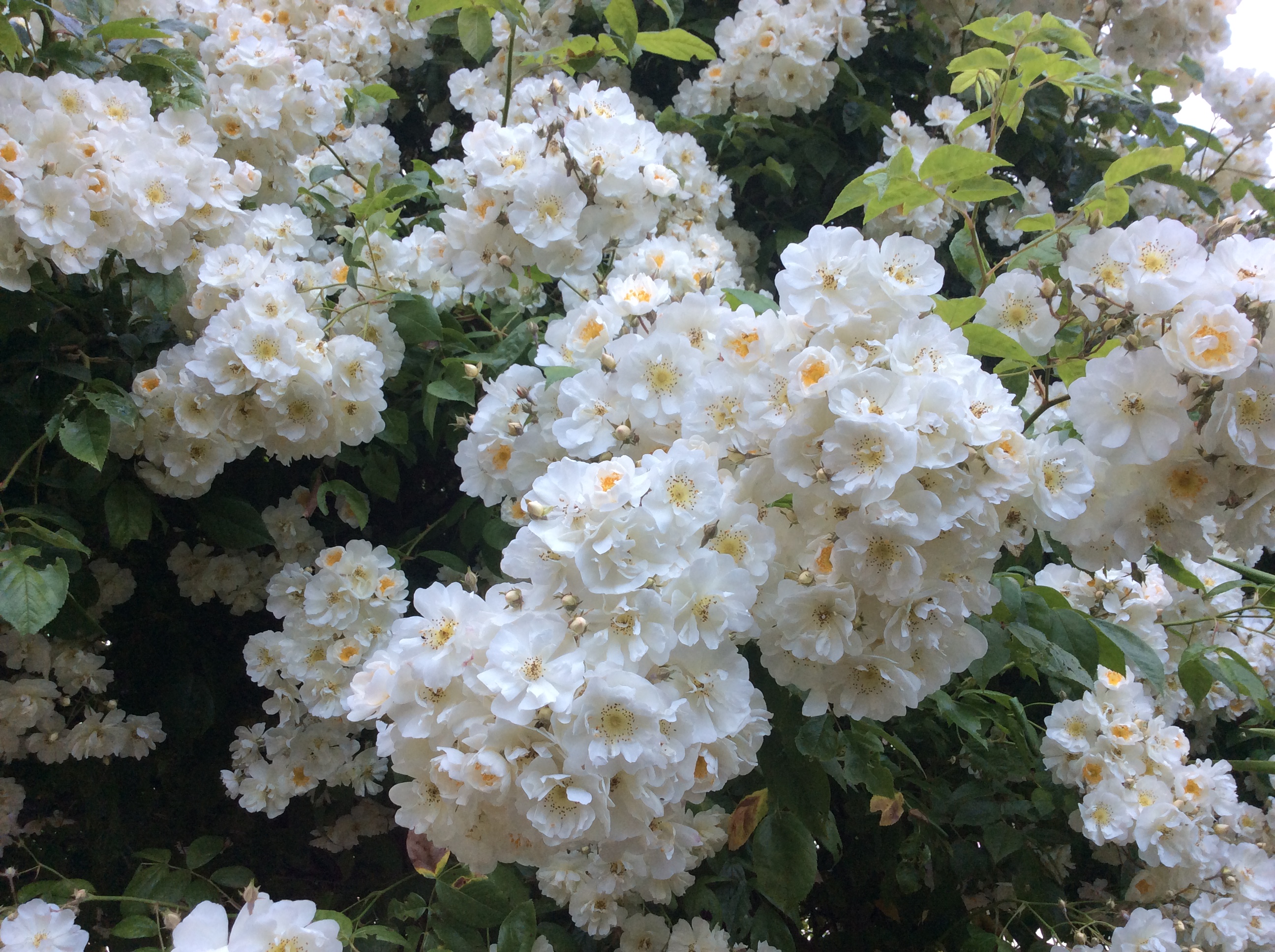 Ce rosier robuste ne fleurit qu'une seule fois mais sa floraison abondante ne manquera pas de vous éblouir. Comme des boules de neiges les fleurs blanches et denses brillent au soleil et on voit de temps en temps les étamines jaunes comme des étincelles.