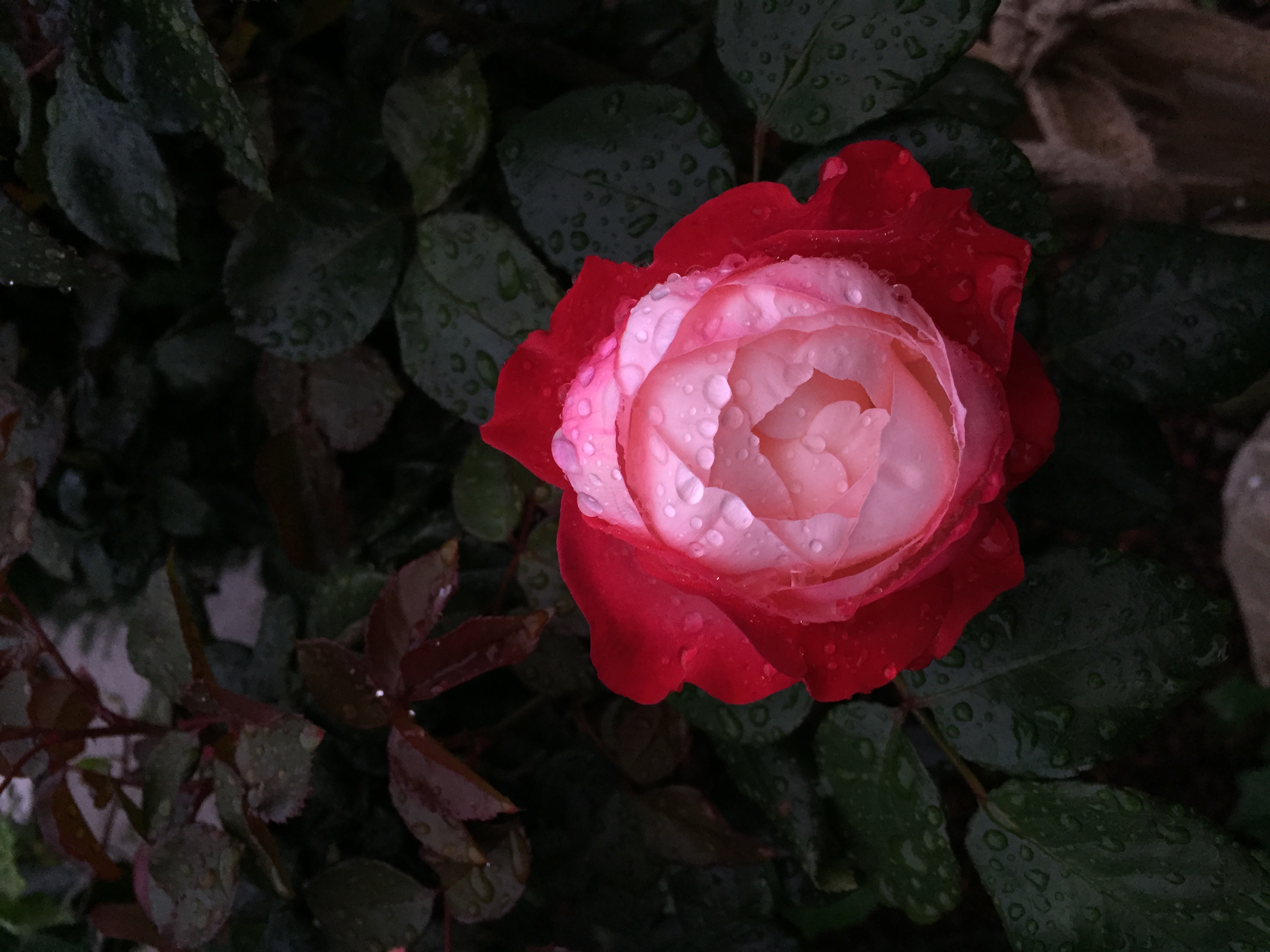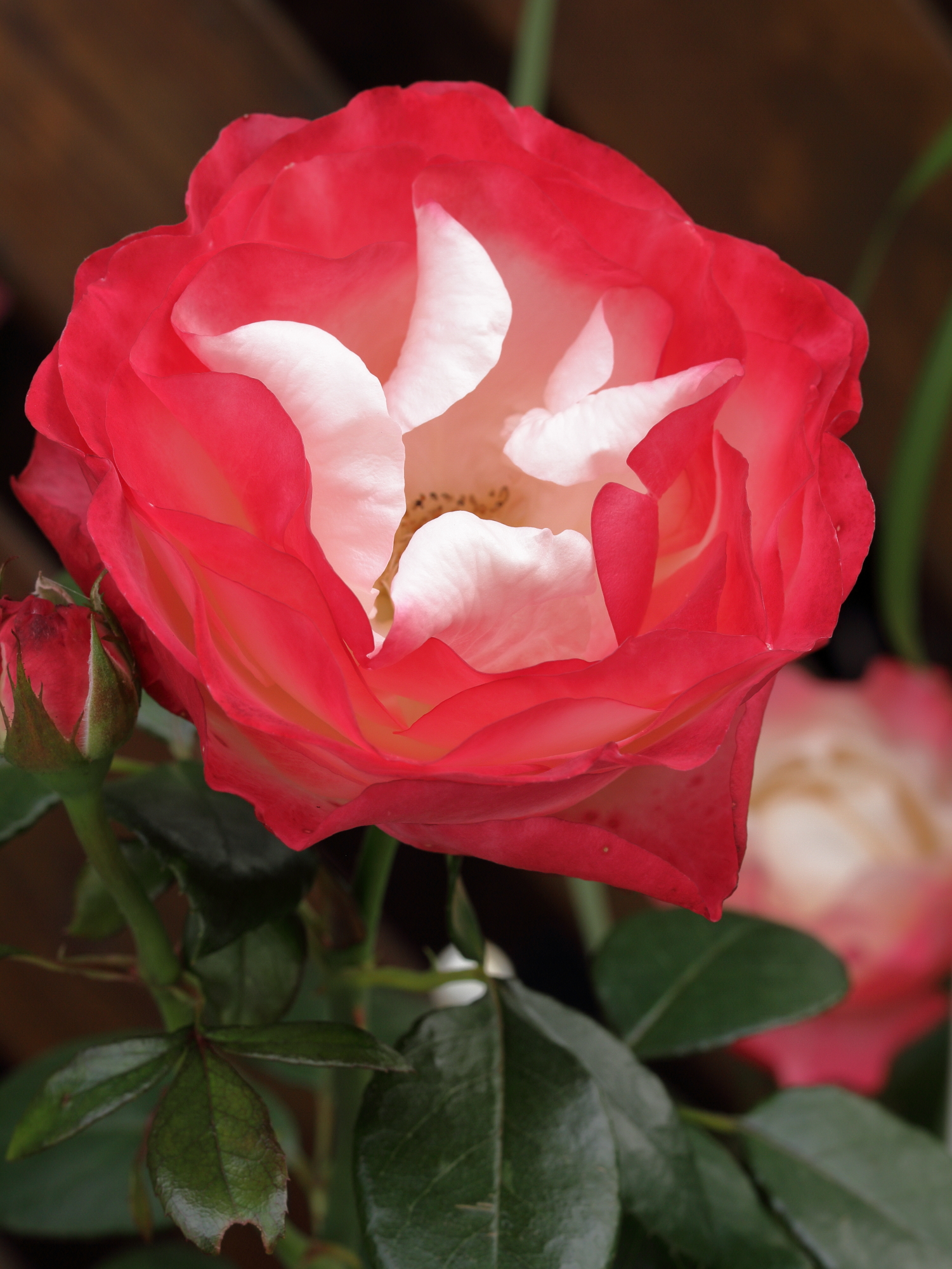 Nostalgie est une hybride de thé bicolore, qui séduit par son parfum et son charme comme fleur coupée. La fusion insolite de rouge et blanc est souligné par le feuillage vert foncé brillant.