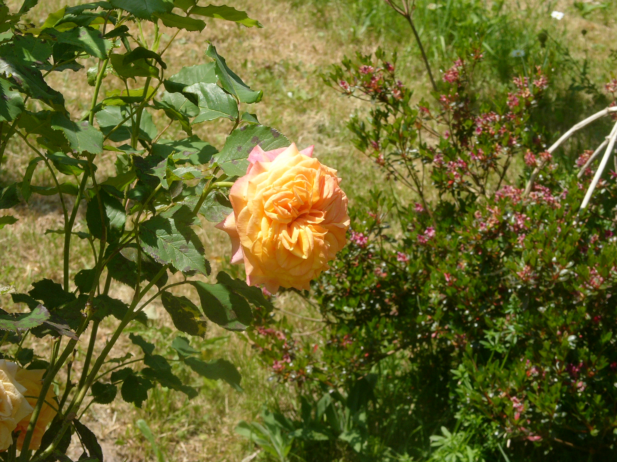 Die stattlichen Wurzelnackten entwickelten sich im Laufe des Jahres zu einer wüchsigen, dauerblühenden Rose , die sich im ersten Jahr kniehoch und buschig präsentiert. Die sich anfänglich in Form und Farbe verändernden Blüten halten sehr lange und sind meine diesjährige Sommerfreude.