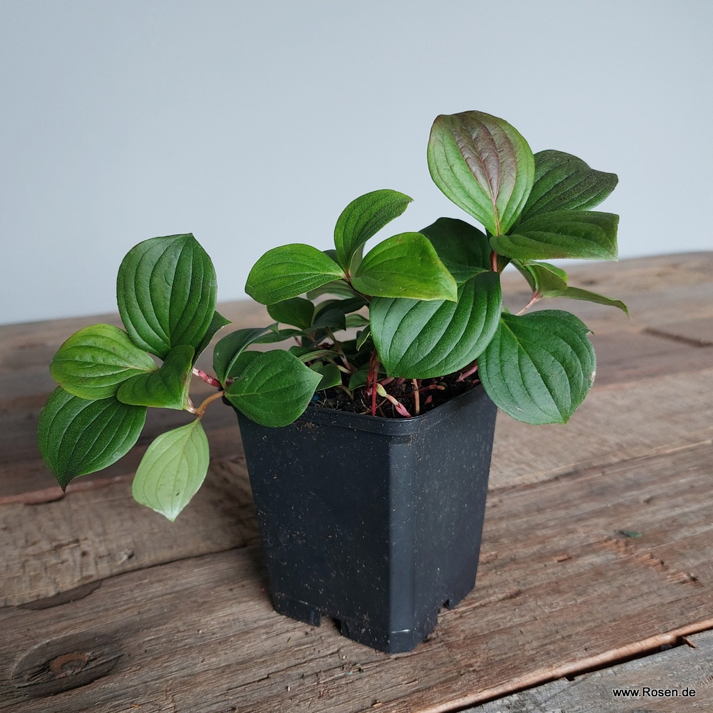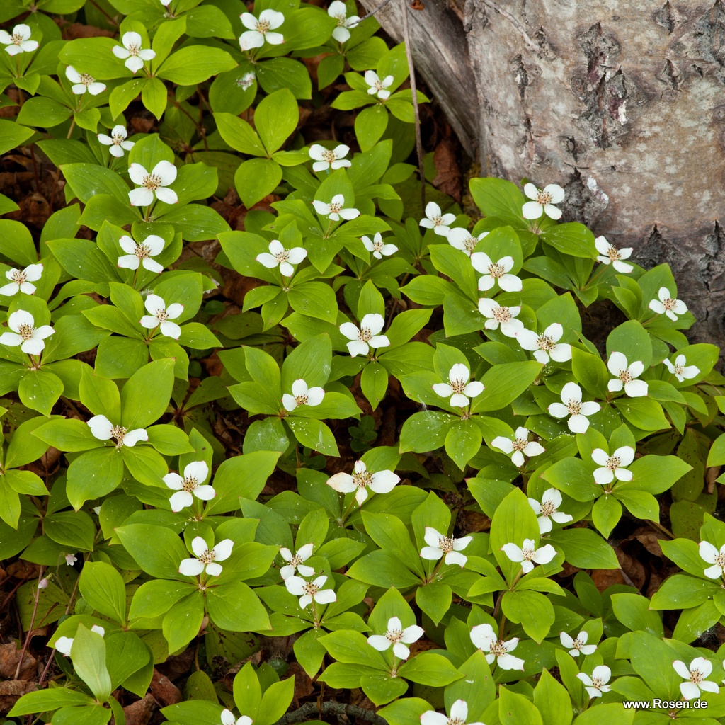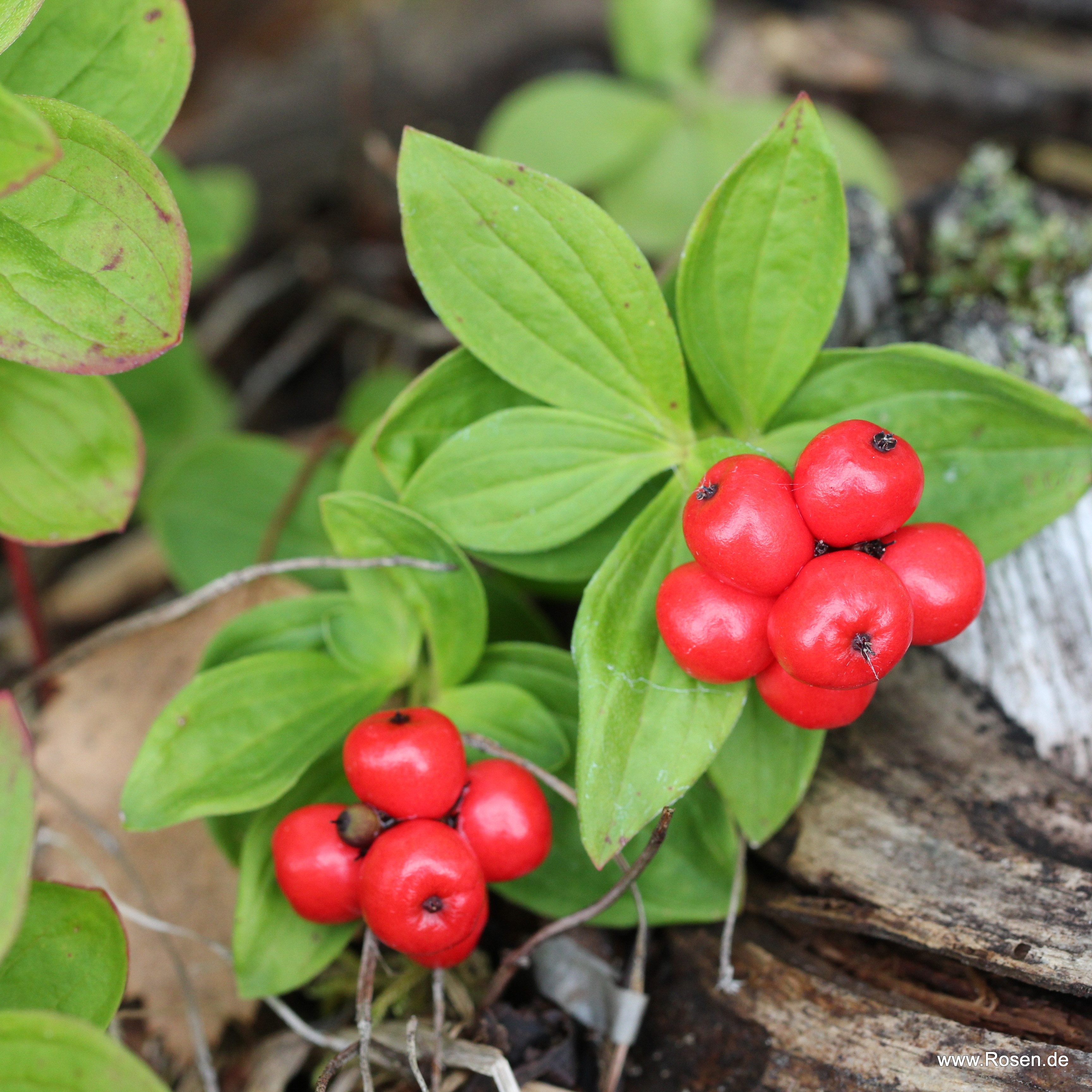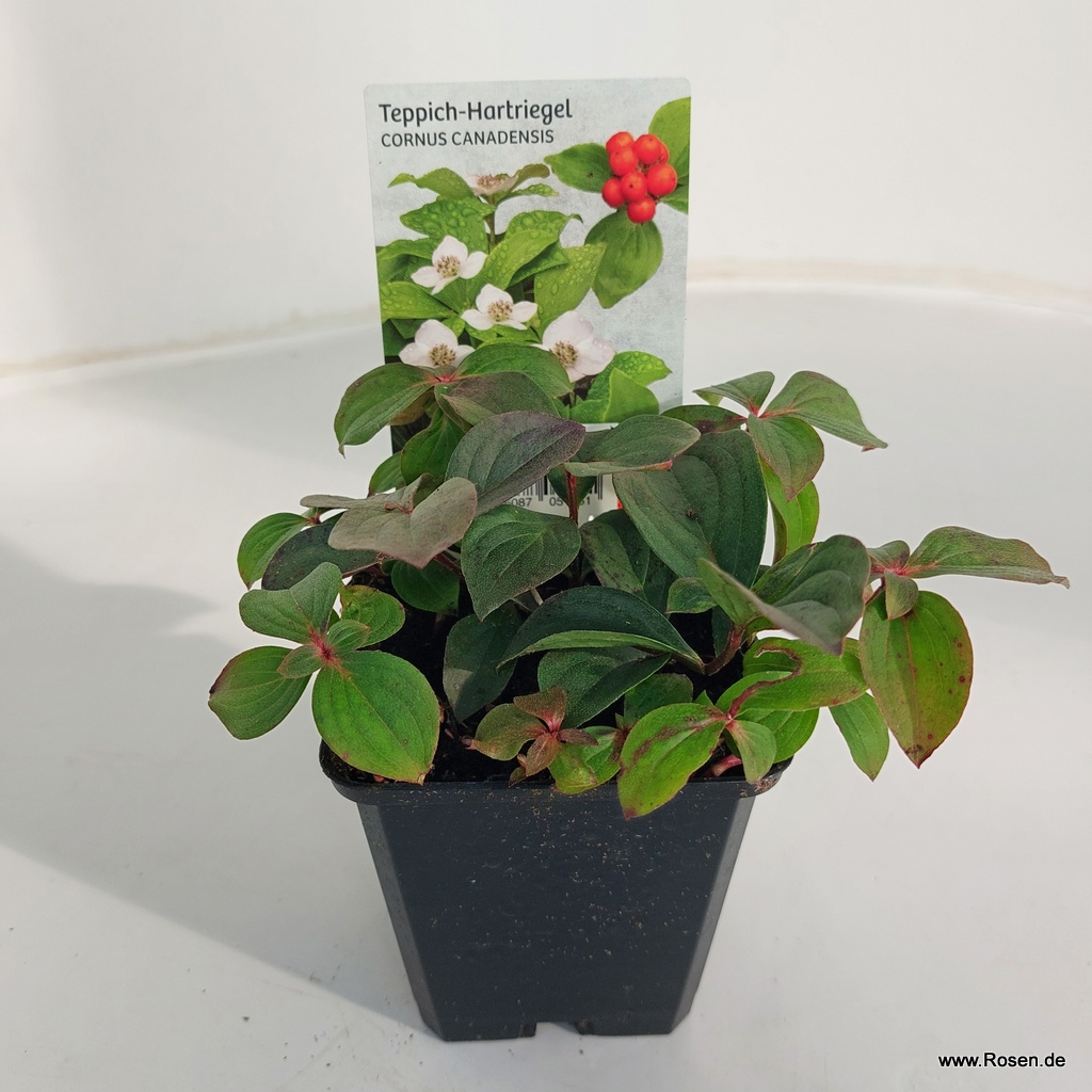 Der kanadische Teppichhartriegel ist ein zuverlässiger Bodendecker, der von Mai bis Juni weiß blüht. Anschließend erschaffen die roten Beeren einen wunderschönen Fruchtschmuck. Im Herbst verfärben sich die Blätter in ein wunderschönes rot. Cornus besitzt giftige Pflanzenteile, die Früchte hingegen sind weder im rohen noch im gekochten Zustand giftig. Jedoch sind die Früchte roh ungenießbar, da sie sehr sauer sind. Sie werden jedoch oft gekocht und zu Fruchtsaft oder Marmelade verarbeitet. Hinzu kommt, dass die Früchte des Hartriegels auch oft in Vogelfutter getrocknet zu finden sind.