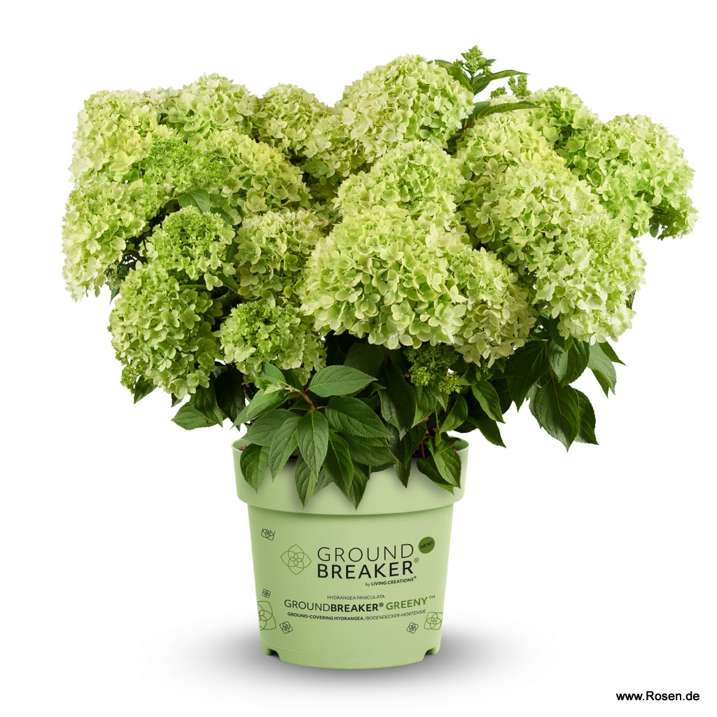 Hydrangea paniculata Groundbreaker® Greeny ist eine außergewöhnliche, bodendeckende Rispenhortensie mit sehr kompaktem, breitem Wuchs. Sie wird nur 40–60 cm hoch und bis zu 80 cm breit. Von Juli bis November schmücken unzählige grüne Blüten die Pflanze und bilden einen dichten Blütenteppich. Ideal für Beete, Töpfe und kleine Gärten. Winterhart bis –30 °C.