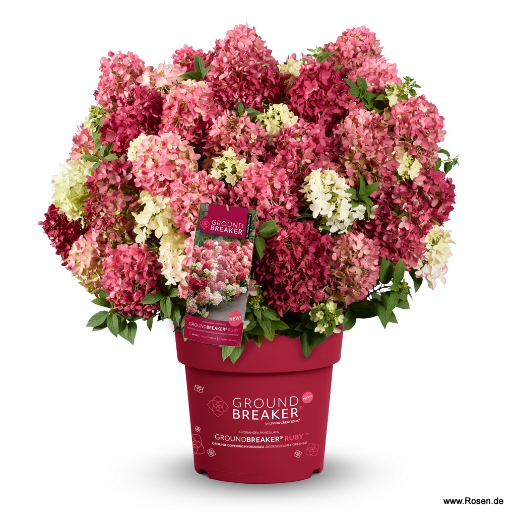 Verwandeln Sie Garten, Terrasse oder Balkon in ein farbenfrohes Blütenmeer mit der innovativen Rispenhortensie ‘Groundbreaker®’ Ruby. Von Juni bis in den späten Herbst verzaubern ihre kegelförmigen Blütenstände mit einem Farbverlauf von Weiß über Rosa bis Rubinrot.