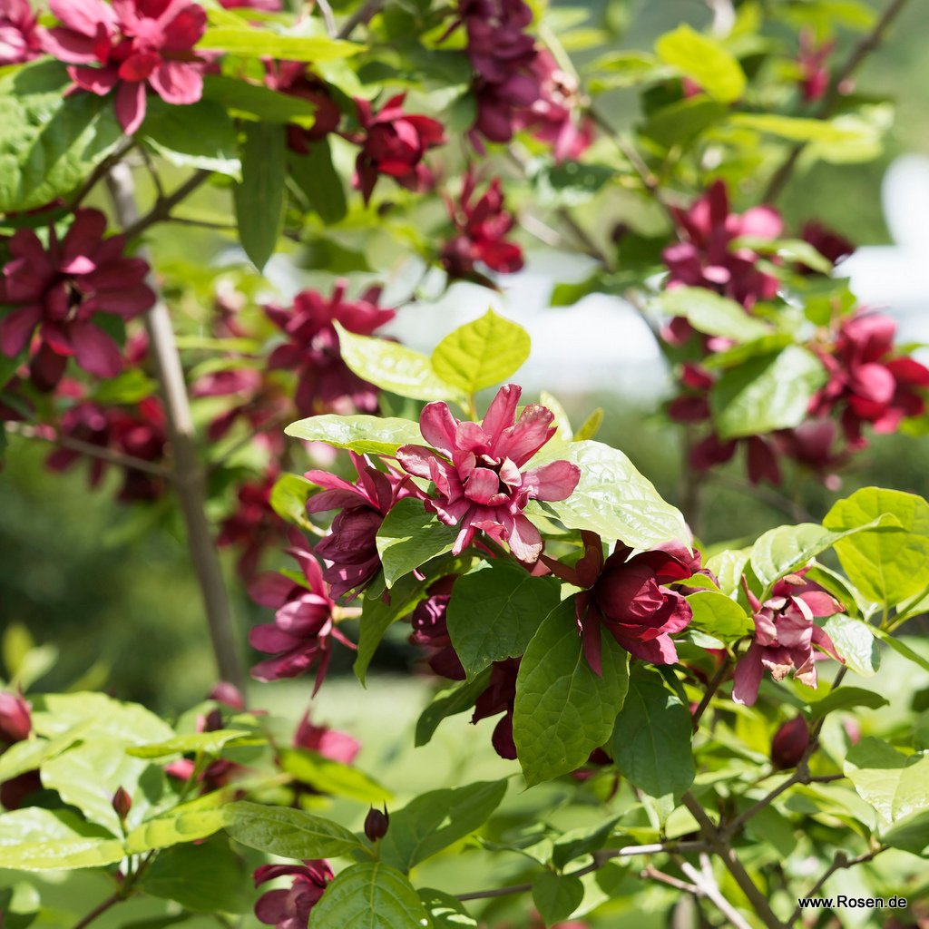 Der winterharte und frostharte Gewürzstrauch (Calycanthus floridus) ist ein beliebter Stauch in Duft- und Aromagärten. Seine Blüten erscheinen im Mai und er blüht im Juni und Juli und duftet dabei herrlich nach Erdbeeren und Nelken. Der Echte Gewürzstrauch wächst unkompliziert an sonnigen oder halbschattigen Standorten und stellt dabei wenig Ansprüche an den Boden. Seine dunkelroten Blüten bilden einen schönen Kontrast zu seinen frischgrünen Laub.