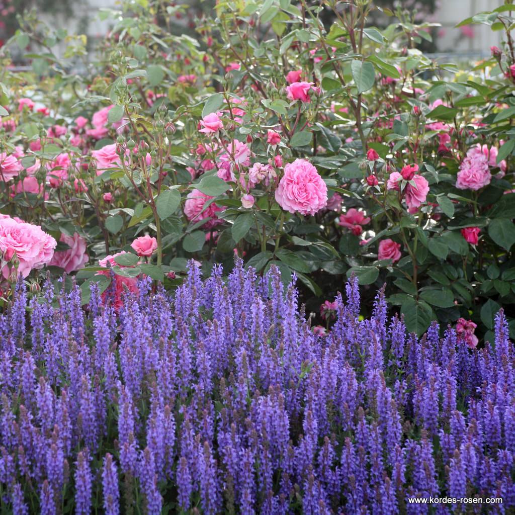 Der Ziersalbei 'Blauhügel' ist ein beliebter Rosenbegleiter. Er wächst recht gleichmäßig und wird meist nicht höher als 30 - 40 cm. Seine eher hellblauen Blüten bilden einen guten Kontrast zu den dunkleren Sorten 'Mainacht' und 'Marcus'. Nach dem Rückschnitt der verblühten Blütenstände erscheint schnell eine üppige Nachblüte.
