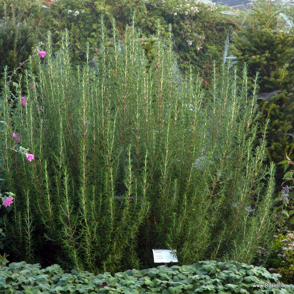 Kräftiges Gewürz - darum nur gut getrocknete Blätter verwenden. Eignet sich als Ersatz für Piment und Lorbeer. Rosmarin würzt mit seinen nadelförmigen Blättchen Kartoffeln, Bohnen, Wild, Käse und Quark. Besonders zu gegrilltem Fleisch empfehlenswert. Als Tee oder Badezusatz wirkt Rosmarin anregend, kreislauf- und durchblutungsfördernd. Der stehende Rosmarin wird bis zu 100 cm hoch, ist nicht zuverlässig winterhart überlebt aber in der Regel an einem geschützten Standort.