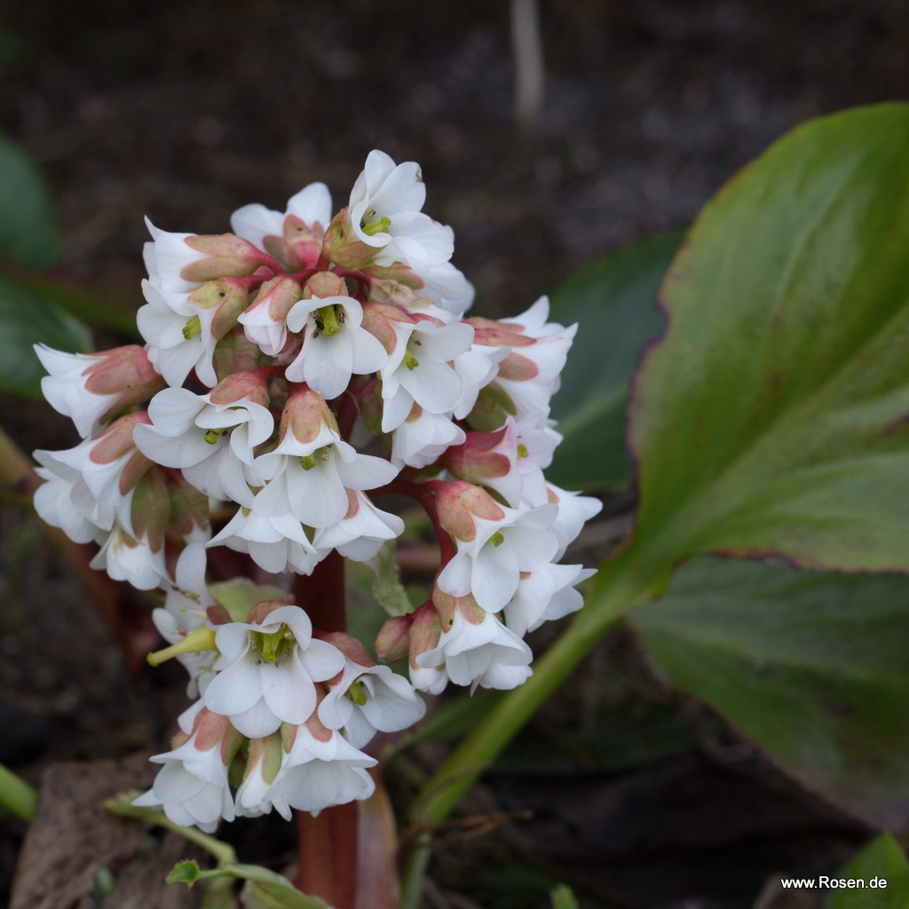 Die Bergenie 'Bressingham White' trägt die für diese Blattschmuckpflanze typischen eiförmigen und dunkelgrünen Blätter, beeindruckt im Frühling aber auch durch ihre glockenförmigen, weißen und in Dolden angeordneten Blüten. Die wintergrüne und frostharte Staude wächst aufrecht ausladend und bevorzugt einen halbschattigen bis schattigen Standort sowie einen durchlässigen und nährstoffreichen Boden.