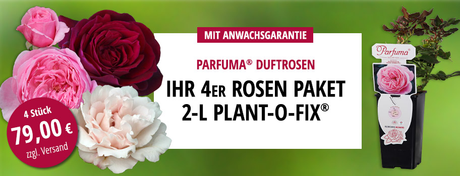 In unserem Duftgenerator können Sie aus den beliebten Parfuma®-Duftrosen vier Sorten wählen, die sinnliche Düfte in Ihrem Garten verströmen. Und das Beste: Die 4 ausgewählten Duftrosen im 2L Plant-o-fix® Topf erhalten Sie im Paket mit Anwachsgarantie zum Preis von nur 79,00 € zzgl. Versand. Übrigens: Unsere Parfuma®-Duftrosen verbinden hohe Gesundheit mit außerordentlich intensivem Duft und wunderschöner Blüte.