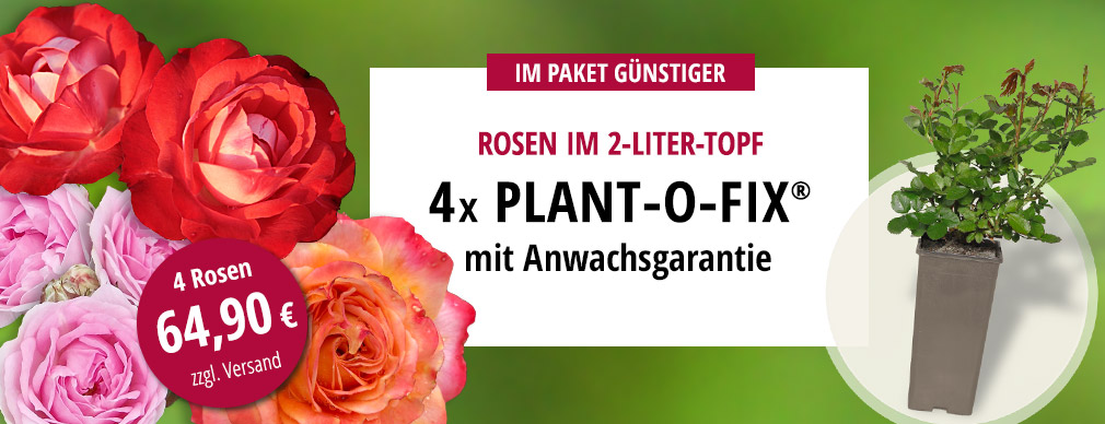 Kombinieren Sie selbst vier Ihrer liebsten Rosen, geliefert im praktischen 2-Liter-Topf Plant-o-fix® mit Anwachsgarantie. Zur Auswahl stehen verschiedene Sorten, auch aus unseren Kollektionen Fantasia® oder Rigo-Rosen®. Sie erhalten das 4er-Paket zum Vorteilspreis von nur 64,90 € zzgl. Versandkosten.