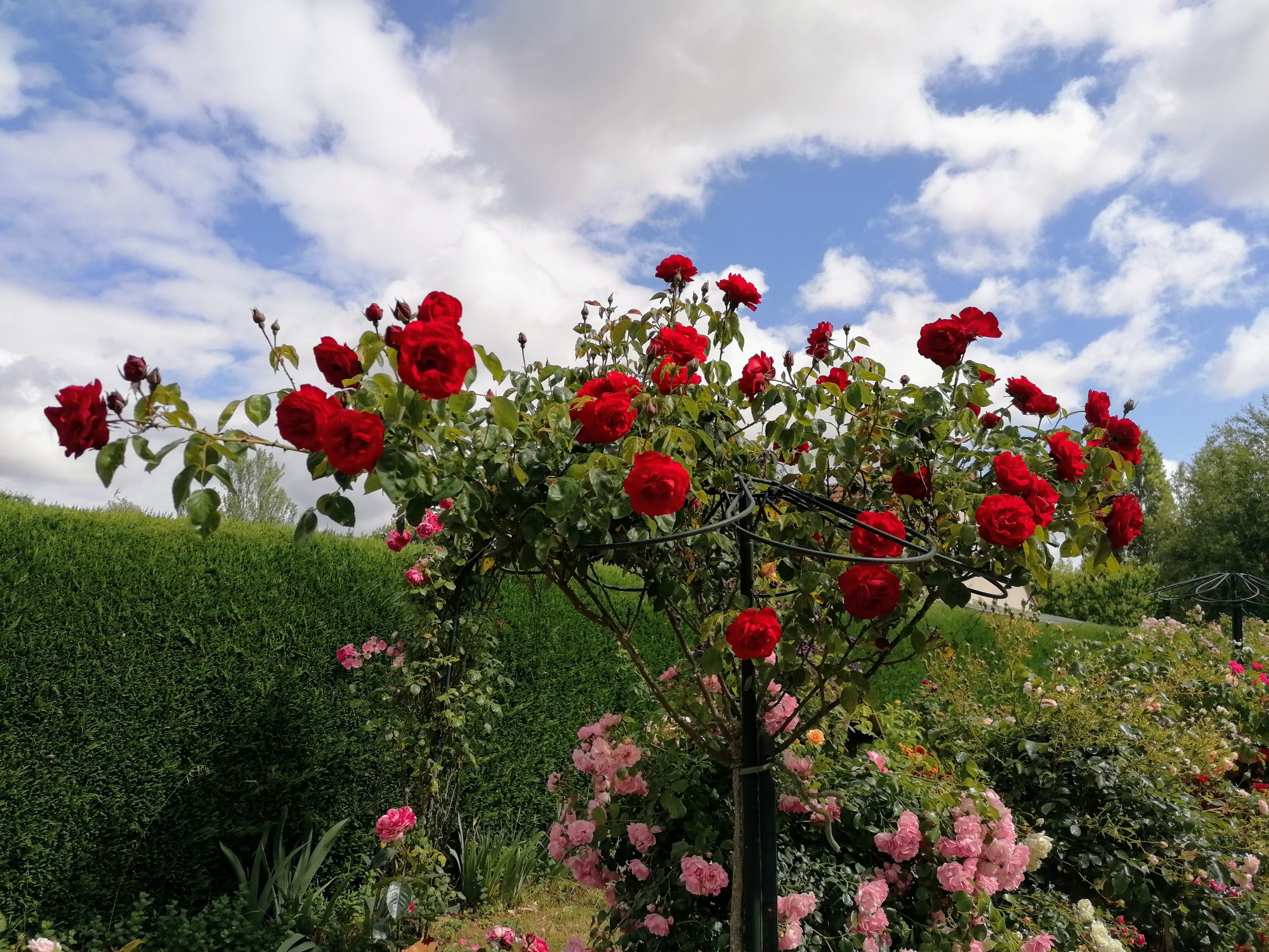 C'est un rosier pleureur qui attire l'attention dans ma roseraie écologique. Il est intégré dans une allée de rosiers tiges et pleureurs. /This weeping standard rose is a real eye-catcher in my ecological rose garden. It is part of an alley of standard and weeping standard roses.