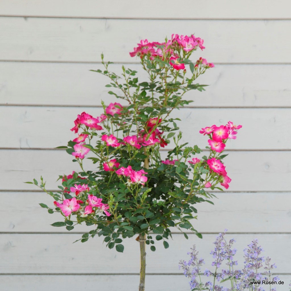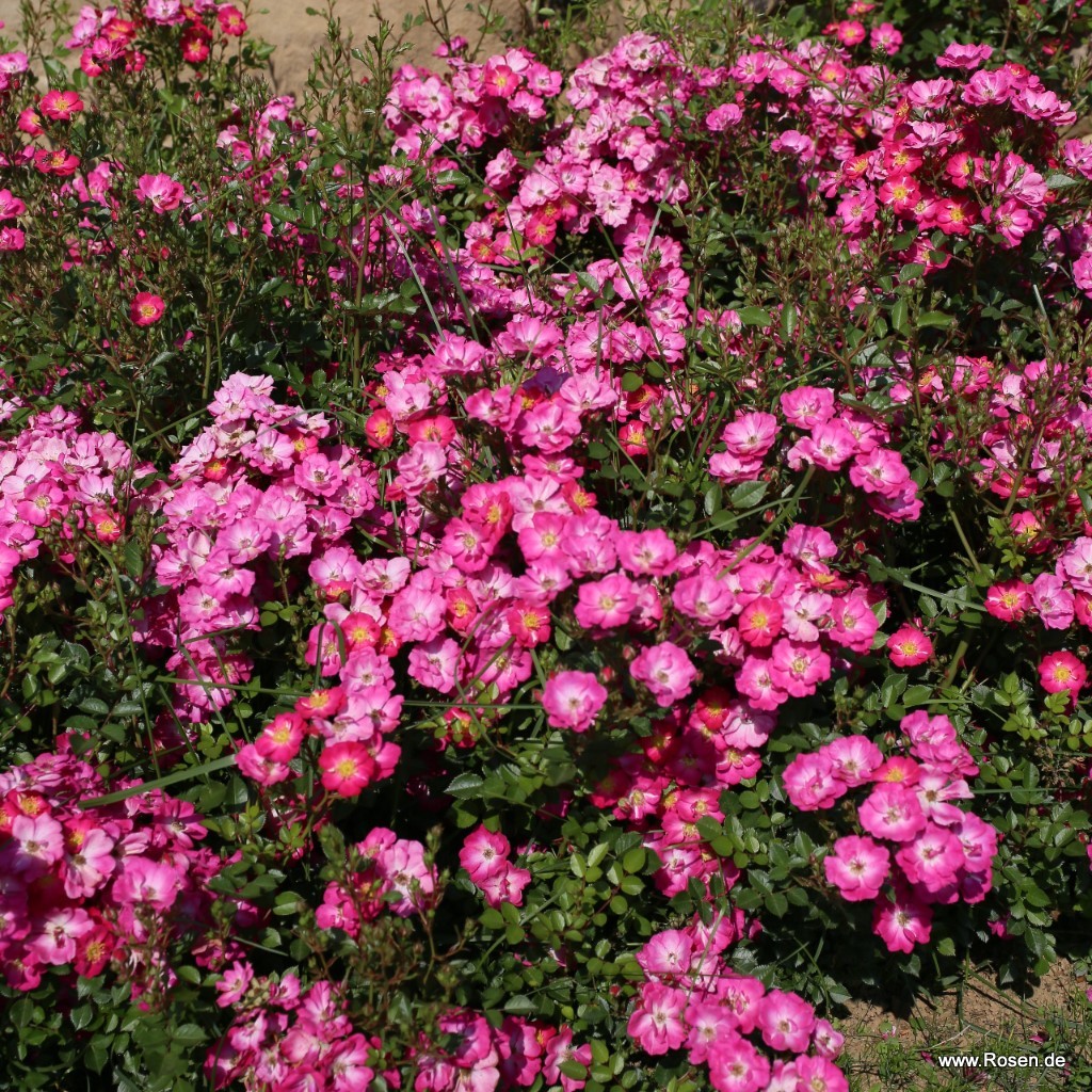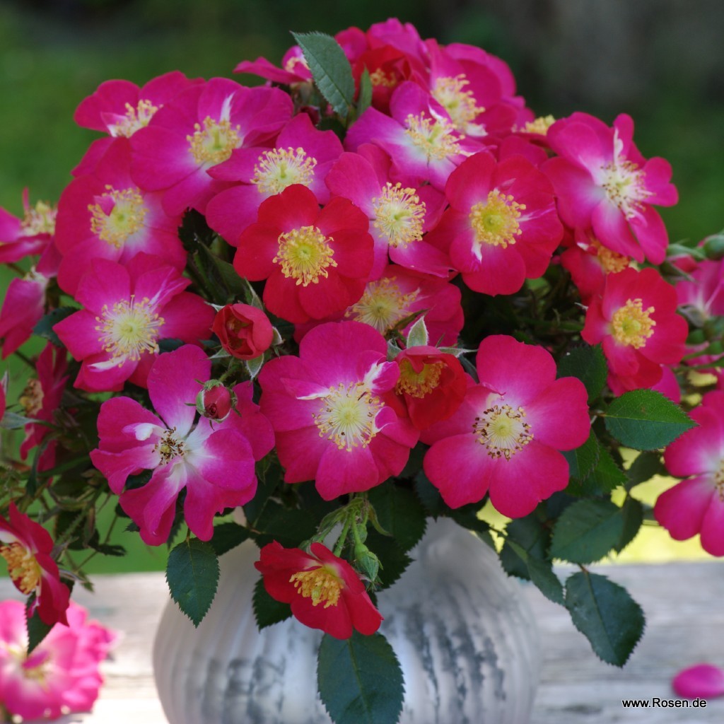 Diese Rose ist ein kleines Wunder. Sie trotzt Hitze und Regen und blüht, blüht, blüht bis in den November. Außerdem strahlen die kleinen Blüten in einem wunderschönen dunklen Pink und werden, wenn man sie nicht abschneidet, im Herbst durch kleine, leuchtend rote Hagebutten ersetzt. Inzwischen haben 7 Lupos einen Platz in meinem Garten gefunden und, je nach Standort, eine Höhe zwischen 30 cm und über 1 m erreicht.