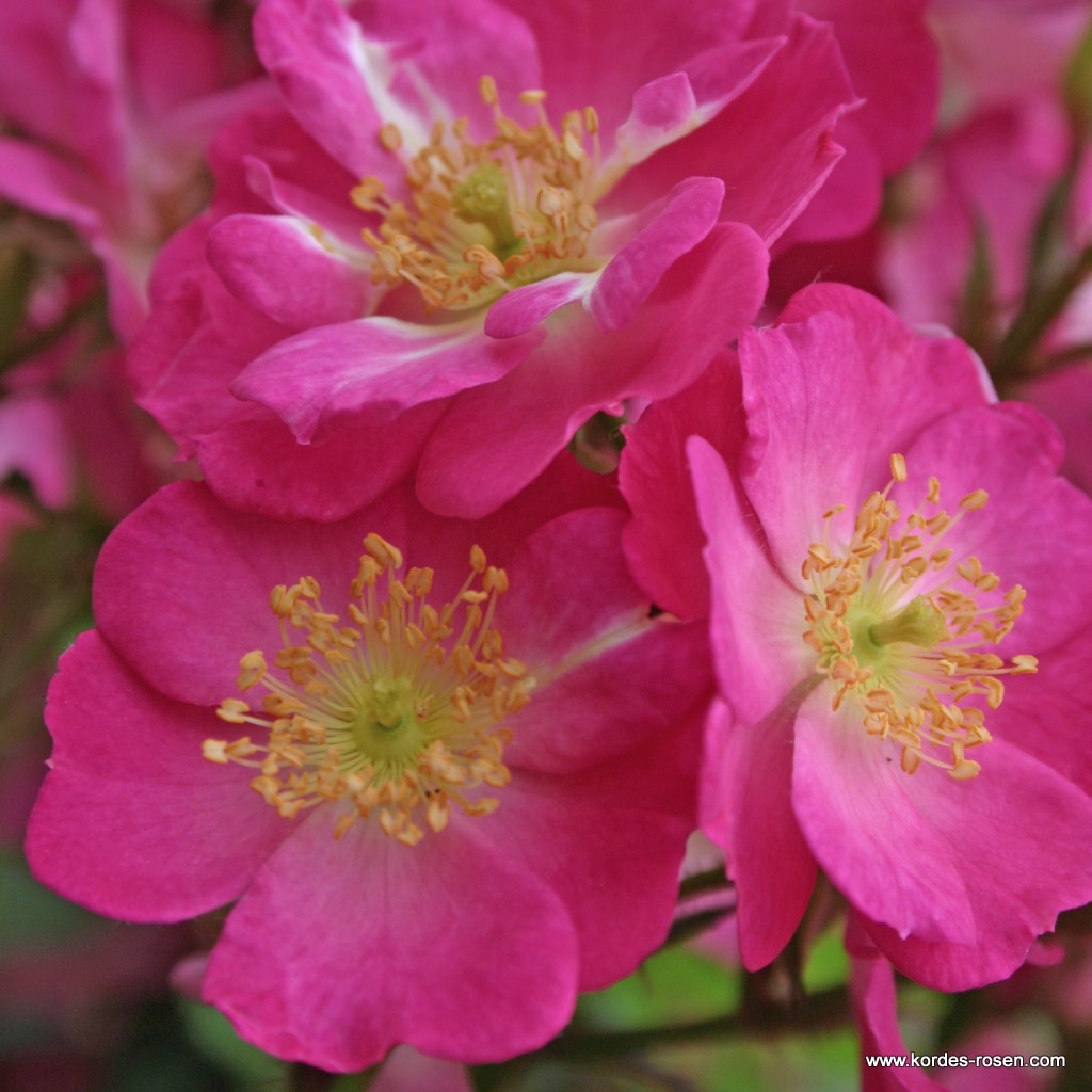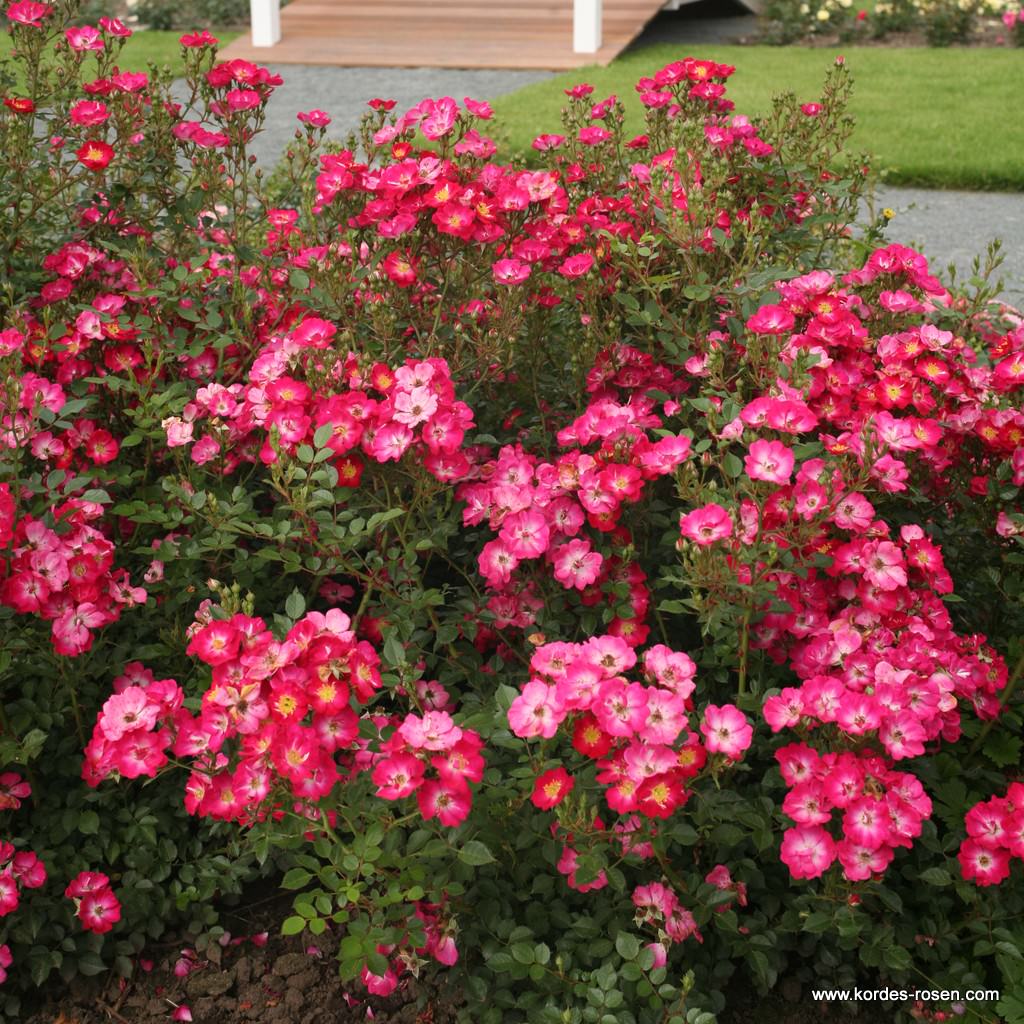 A very dense and compact miniature rose with flowers in abundance in a brilliant colour that are resistant to rain and sun. Excellent for landscape purposes, with many hips in autumn. ADR 2007.
