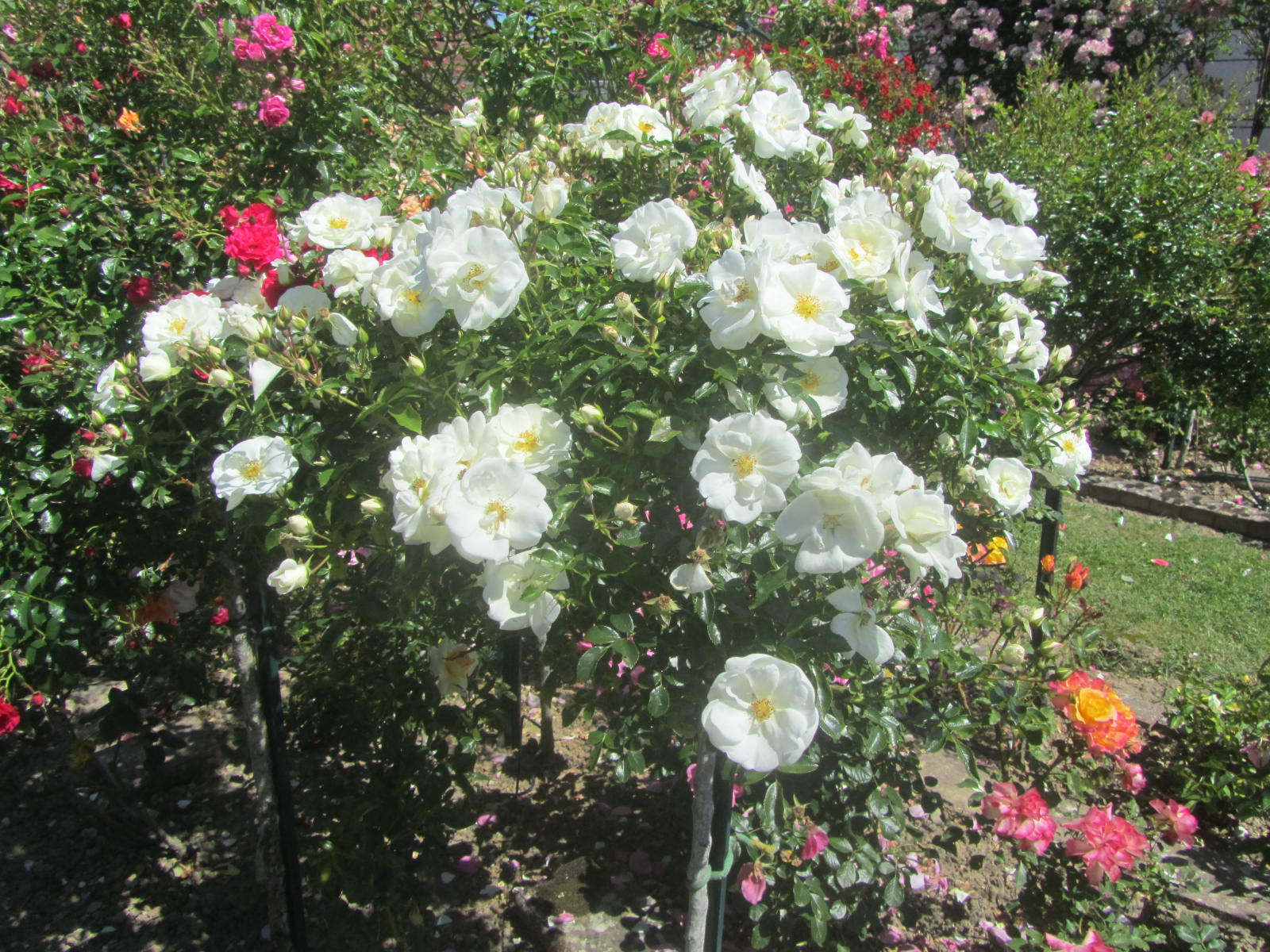 Un rosier tige que tous les visiteurs admirent dans ma roseraie écologique. Ce rosier est très florifère et remontant /A standard rose that all visitors admire in my ecological rose garden. This rose is very floriferous and repeat flowering.