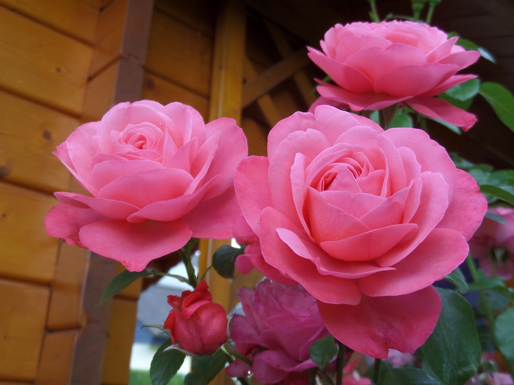 Edel-und Kletterrose vereint. Ein Blühwunder. Ich hab sie so geschnitten, dass sie sowohl Kletter- als auch Strauchrose ist. Bei dieser Rose ist alles perfekt. Sie ist so schön, dass jedes Jahr Vögel in ihr nisten.