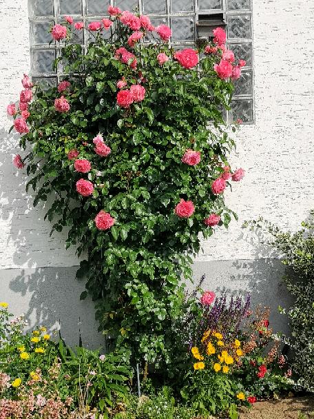 Ich habe diese Rose vor ca, 10 Jahren gekauft. Sie wollte erst nicht recht wachsen und stand als "Strauchrose" vor einer Nordseitenmauer. Plötzlich vor 3 Jahren fing sie an in die Höhe zu wachsen. Seit letztem Jahr dominiert sie mit starken Zweigen und gesundem Blattwerk eine Fläche von mindestens 2 Metern in Höhe und oben über die Mauer wachsend in der Breite. Sie trägt mit einem starken Zweig auch noch eine Clematis. Die Blüten sind sehr groß, perfekt geformt in einem wunderschönen dunklem rosarot. Sie braucht nur einen Pfahl als Halt. Sonst steht sie mit ihren starken Zweigen weitgehend selbstständig. Die Blüte hält sehr lange. Ein wunderschöner Blickfang und eine wahre Freude.