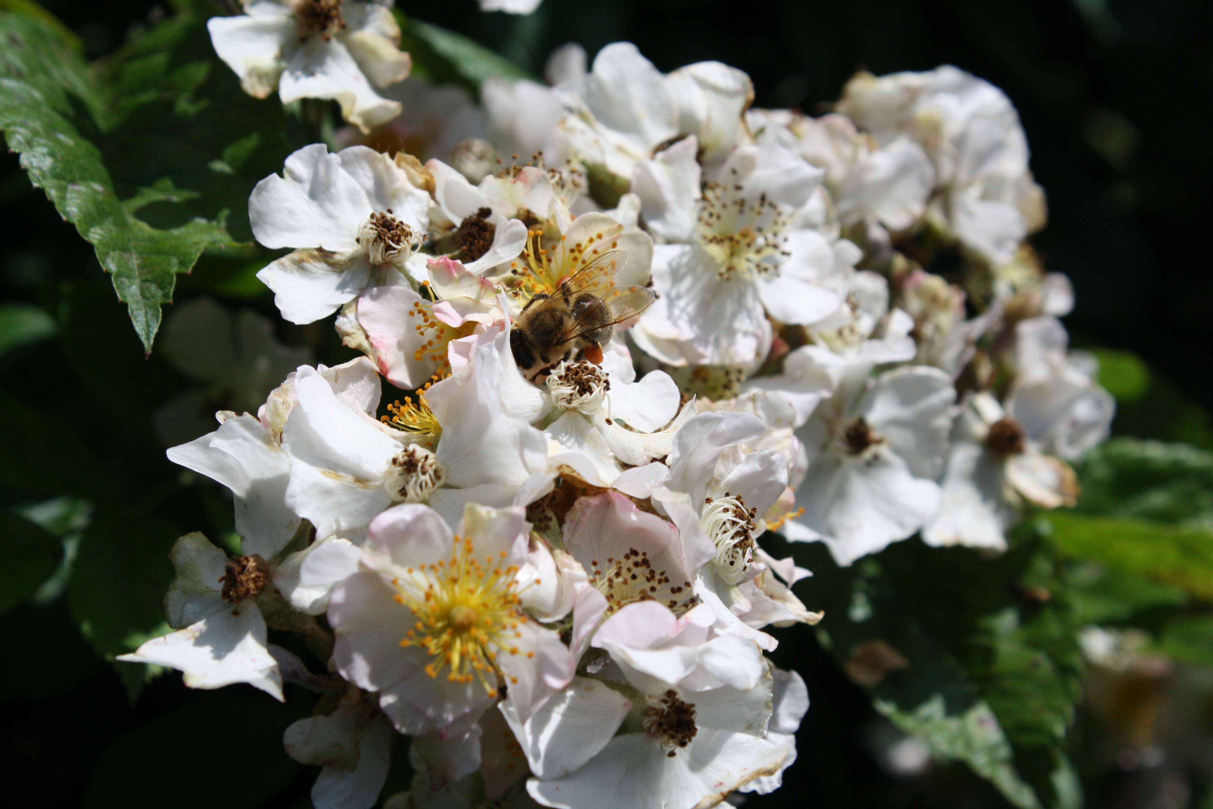 Diese Rose ist ein absoluter Bienen- und Hummel-Magnet! Besonders in den Morgenstunden gehts wild her am Rosenstock. Sie treibt im Frühling sehr früh aus und schmückt den Garten mit ihrem hellgrünem Laub. Während der Blüte ist sie ein fantastischer Blickfang und im Herbst schmückt sie sich mit hübschen kleinen Hagebutten. Wer Platz hat (die Rose wird riesig) und naturnahe Gärten mag, der wird mit dieser Rose richtig glücklich werden.