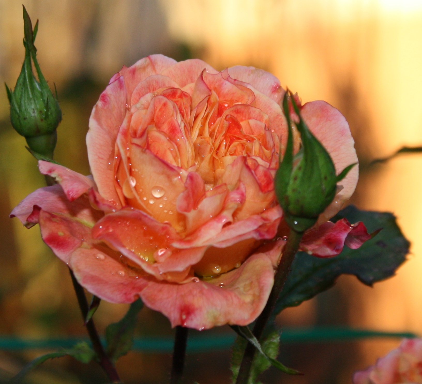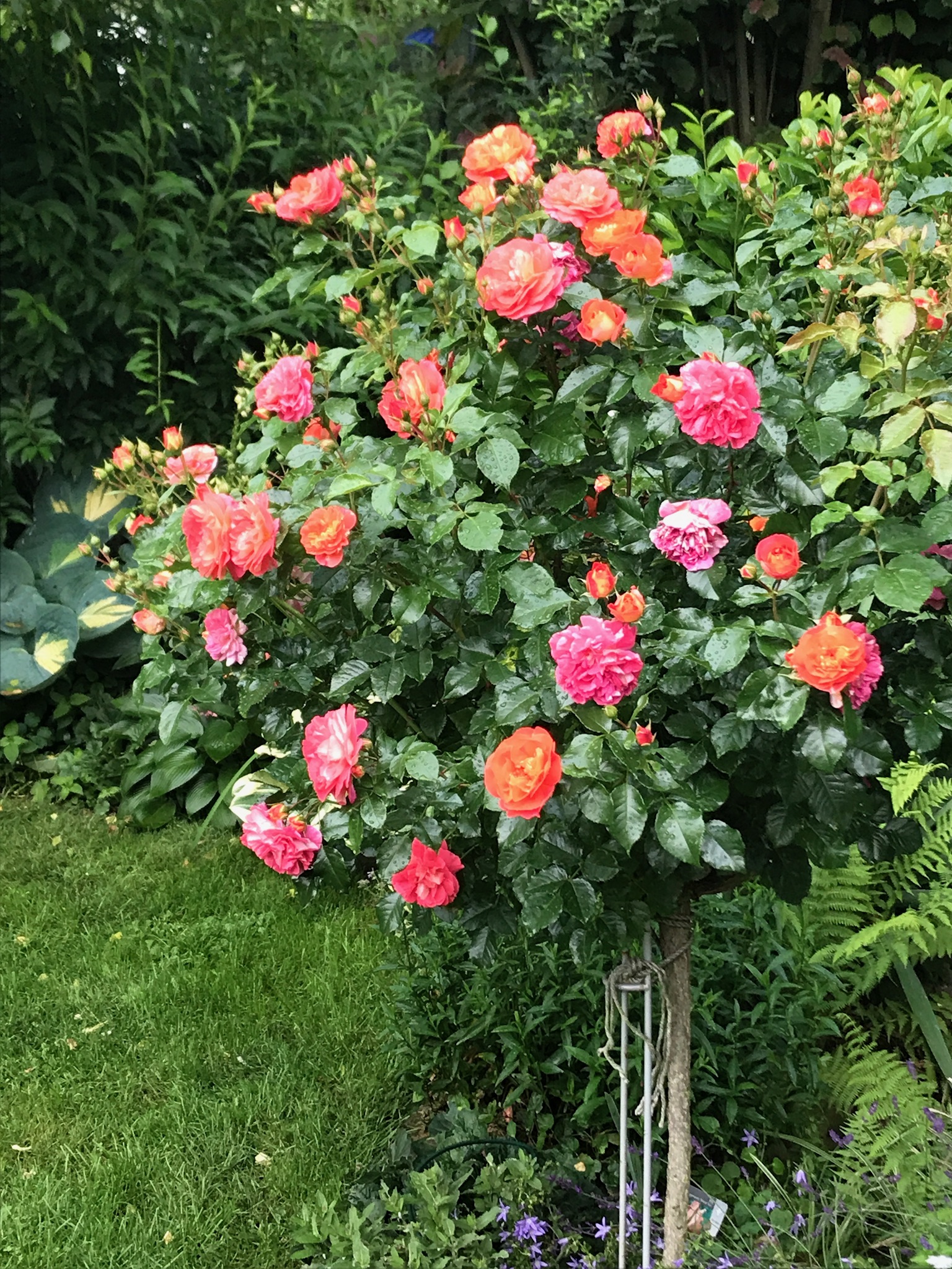 Meine Rose "Gebrüder Grimm" ist jetzt nach 4 Jahren so üppig gewachsen, sowohl in die Höhe als auch in die Breite, daß ich sie abstützen muß. Sie blüht in märchenhaftem Orange-Rot. Die Blüten sind sehr groß jedoch nicht lange haltbar, allerdings es erblühen ständig neue.