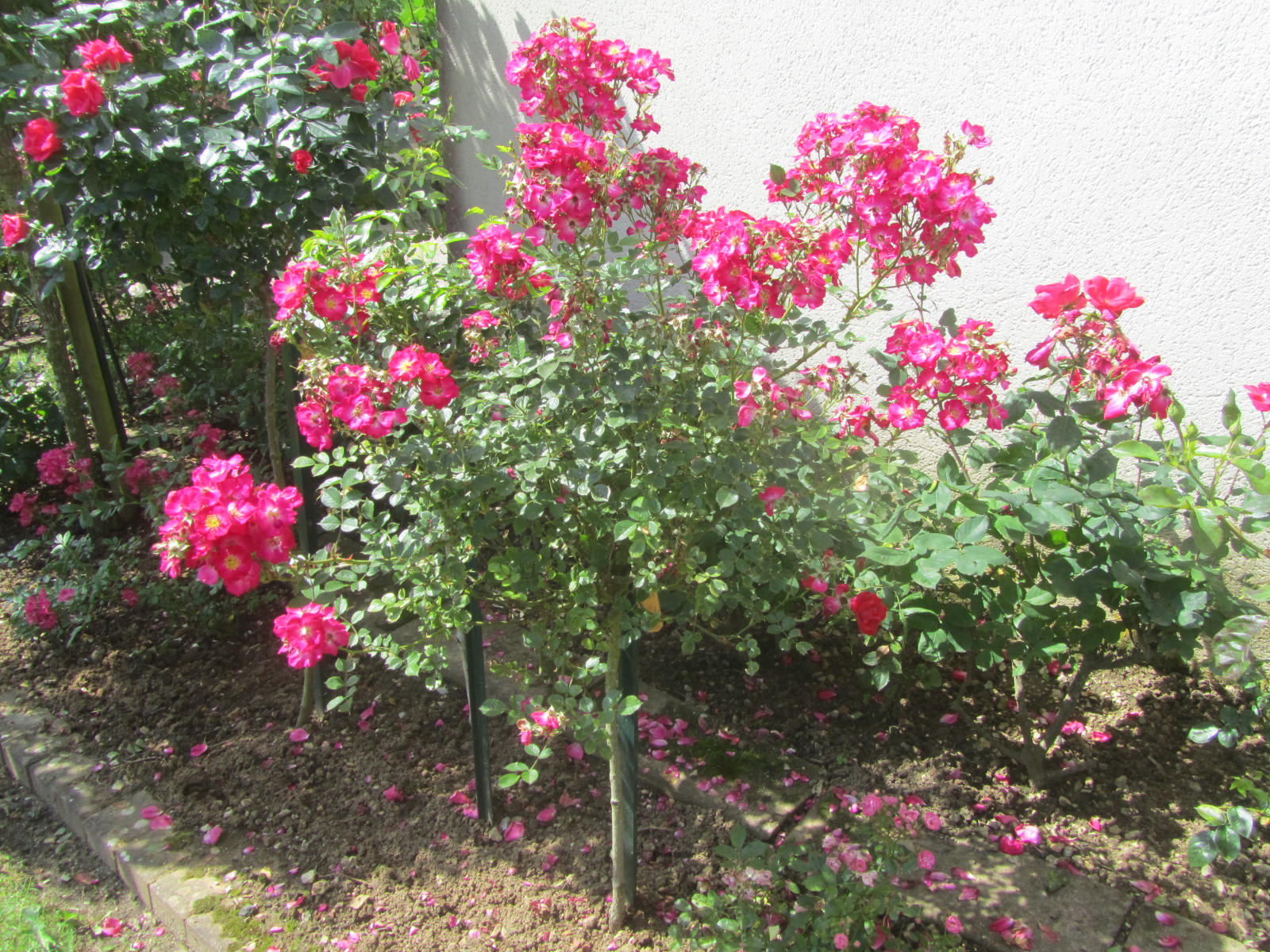 Diese Rose ist ein kleines Wunder. Sie trotzt Hitze und Regen und blüht, blüht, blüht bis in den November. Außerdem strahlen die kleinen Blüten in einem wunderschönen dunklen Pink und werden, wenn man sie nicht abschneidet, im Herbst durch kleine, leuchtend rote Hagebutten ersetzt. Inzwischen haben 7 Lupos einen Platz in meinem Garten gefunden und, je nach Standort, eine Höhe zwischen 30 cm und über 1 m erreicht.