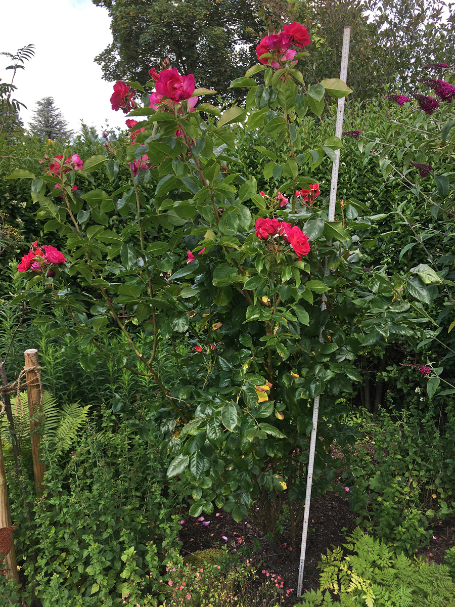 Diese Rose wächst bei mir jetzt das dritte Jahr an einem sehr trockenen und kargen Standort und ich hatte nicht wirklich damit gerechnet, dass sie sich so gut macht. In der Beschreibung wird eine Wuchshöhe von 120 cm angegeben, aber bei mir misst sie jetzt mittlerweile ganze 2 Meter (siehe Bild). Bei sonnig-warmen Wetter verströmt sie einen zarten Duft und ihre Blütenblätter besitzen ein Farbenspiel, die fast an ein Aquarell erinnern. Ihre Blätter zeigen mit Abstand die gesündesten Blätter unter all meinen Rosen. Ich bin mit dieser Rose jedenfalls überglücklich.