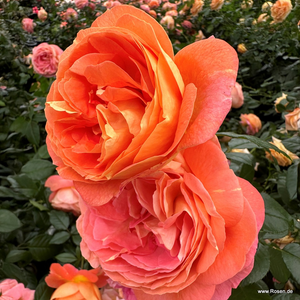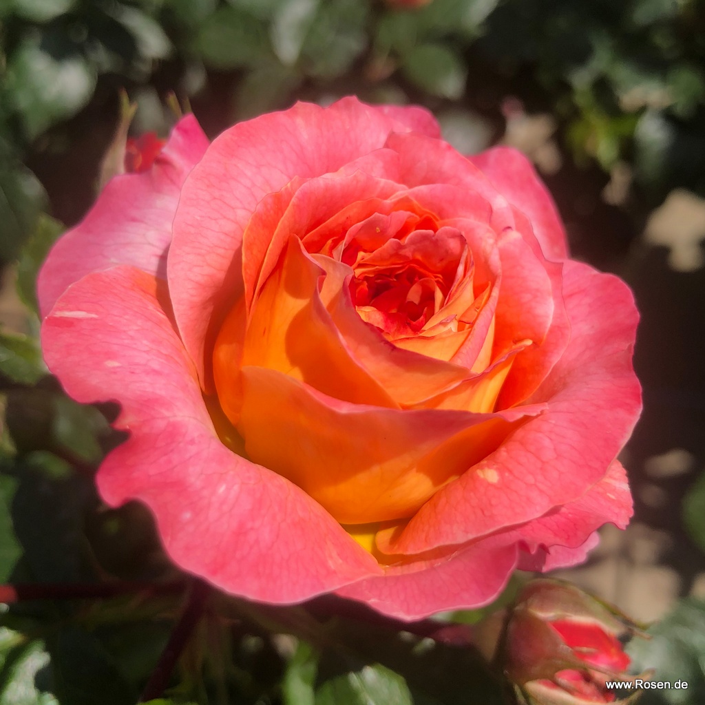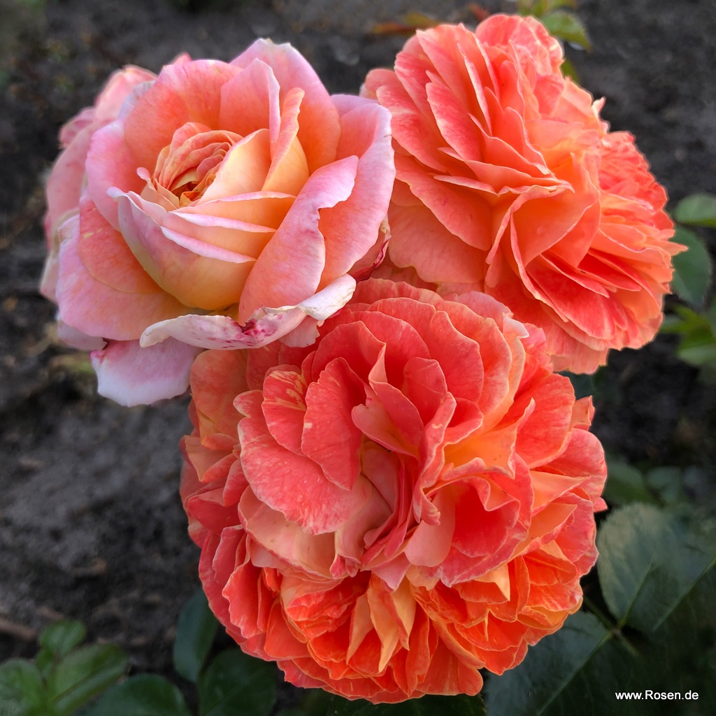 Buschig-kompakt wachsende Beetrose mit nostalgisch geformten Blüten in kleinen Dolden und gesunder Belaubung. Die mittelgroßen, dicht gefüllten Blüten zeigen ein frisch-fruchtiges Farbspiel aus kräftigem Orange mit gelber Unterseite.