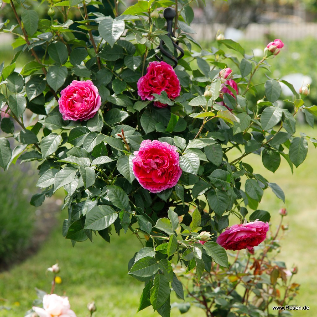 Nachdem die Rose anfangs sehr große Köpfe auf schwachen Stielen hatte, die sich auch nicht öffneten, ist sie nun im 3. Jahr eine wunderbare Rose mit voll geöffneten geviertelten Blüten geworden. Die Pflanze ist total gesund und kräftig und der Duft ganz wunderbar sowie auch die kräftige Farbe. Es stehen 2 Exemplare nebeneinander, so dass sie eine herrliche Fläche bilden, gerahmt mit blauem Salbei.