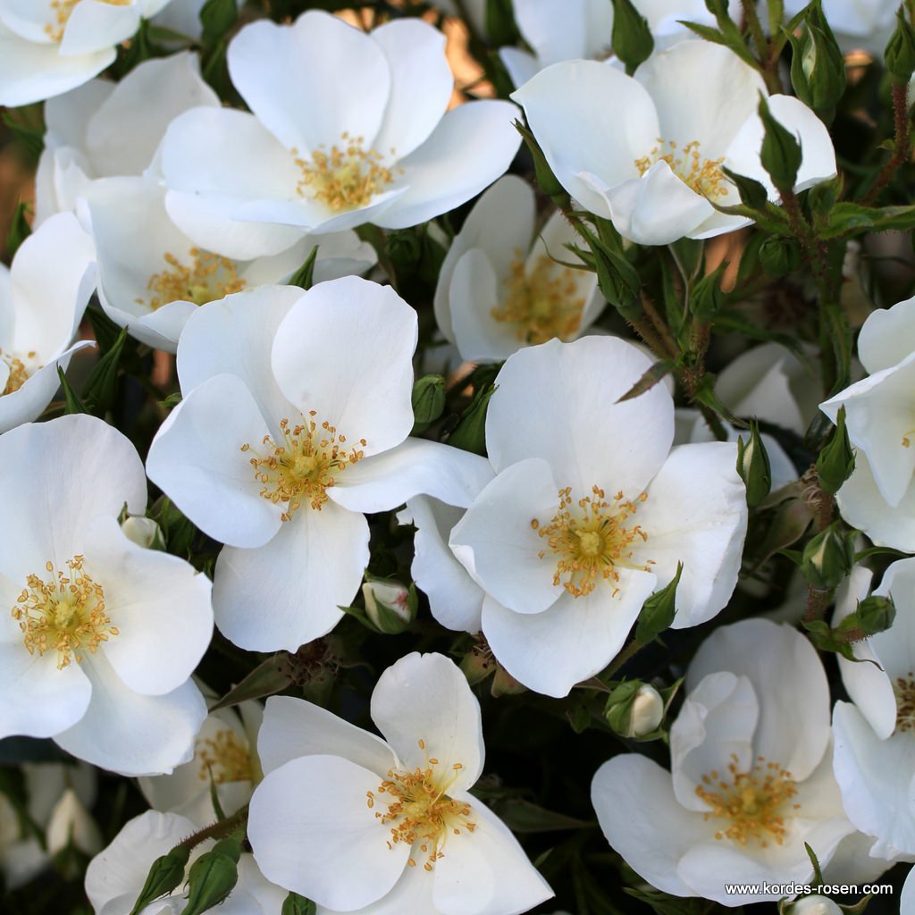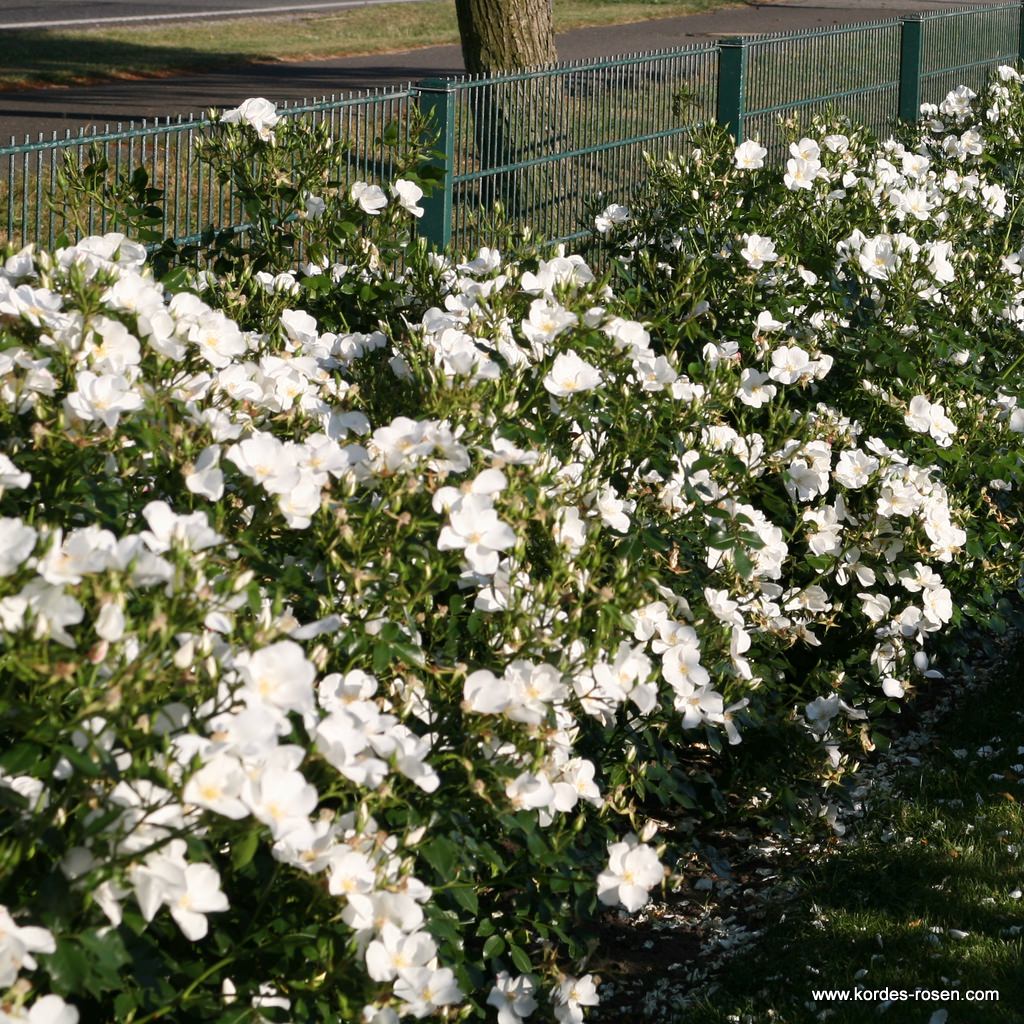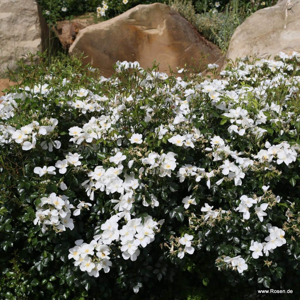Escimo® ist sehr harmonisch wachsend, mit natürlichem Charme und hoher Blattgesundheit. Weiße, unempfindliche Blüten vom Frühsommer bis zum Herbst. Die Kleinstrauchrose ist Teil der Heckenzauber® Kollektion.
