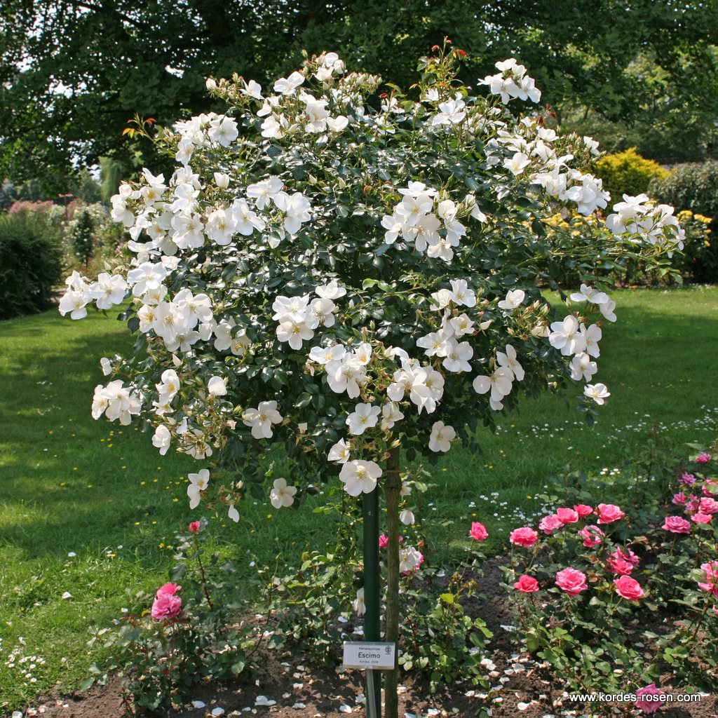 Als ich diese Rose zum ersten Mal auf der Insel Mainau sah, war ich hell begeistert. Rein weiße Blüten wie übergroße Himbeerblüten und das schöne dunkelgrüne, glänzende Laub! Ich bestellte im Herbst fünf Exemplare, die auch alle angewachsen und durch den schneereichen Winter gekommen sind. Jetzt blühen sie zum ersten mal und jeder, der vorbeikommt, ist fasziniert. Da die Rose schlicht weiß ist, passt sie zu allen anderen Rosenfarben und eignet sich hervorragend als Unterpflanzung unter Rosenstämm, denn sie bildet einen Kontrast zu den gefüllten Sorten. Hier am Bodensee schafft die Rose es auf über einen Meter Höhe und auch ein halbschattiger Standort macht ihr anscheinend nichts aus. Die Blätter sind gesund und es hängen niemals abgeblühte oder verregnete Blütenblätter an der Rose herum, sie sieht stets gepflegt aus, ohne dass man Abgeblühtes abschneiden muss. Escimo ist eine Superempfehlung.