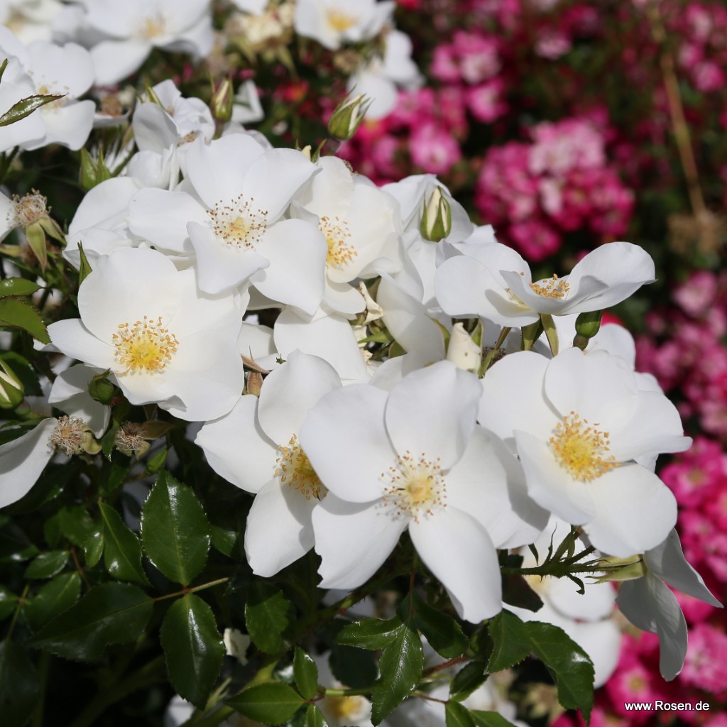 Diese Rose steht seit 2 Jahren bei mir im Topf. Die zahlreichen weißen Blüten strahlen auf dem dunklen Laub wie weiße Sterne. Außerdem ist die Rose sehr robust. Einziger Wermutstropfen ist, dass die Rose nur von wenigen Insekten besucht wird.