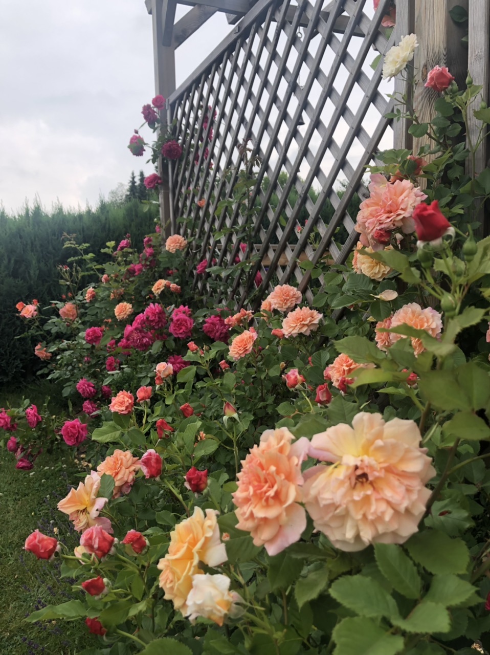 Meine einzige Kordes-Rose, von der ich nicht restlos begeistert bin. Gepflanzt im Herbst 2018, schoss sie letztes Jahr schon weit über die angegebenen 3 Meter hinaus. Die Triebe sind sehr sperrig und unlenkbar und wachsen kreuz und quer. Dafür sind die Haupttriebe unten völlig kahl. Letztes Jahr war sie meine einzige Rose, die unter einem späten Frost nach dem Austrieb litt, die neuen Triebe starben ab. Ob wohl deshalb die Blüte ziemlich spärlich ausfiel? Die Blüten selber sind zweifellos wunderprächtig. So lange es nicht regnet, das goutieren sie nicht. Alles in allem mehr Stirnrunzeln als helle Freude.