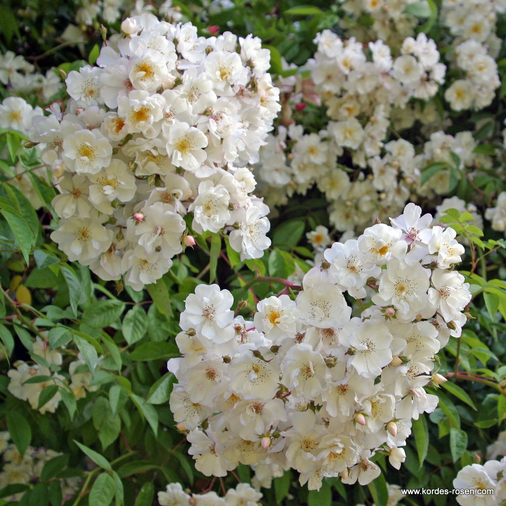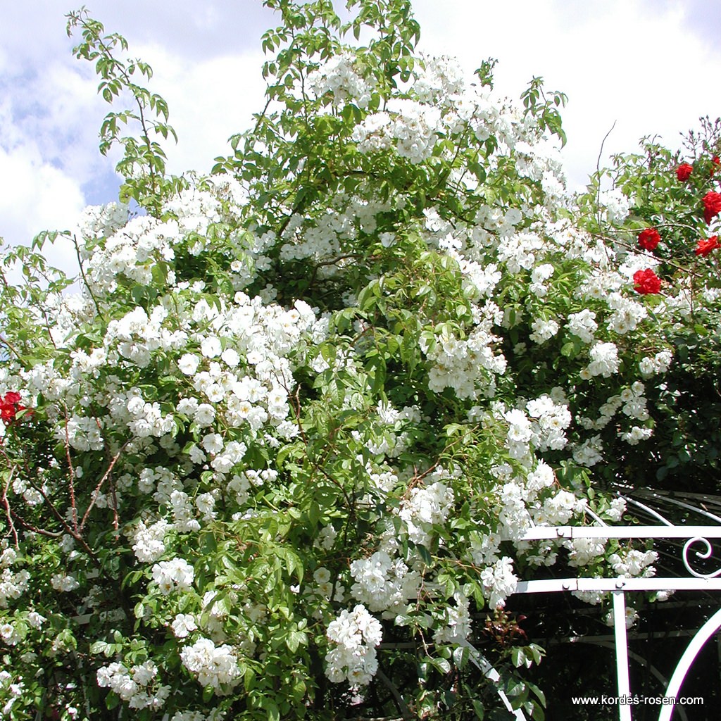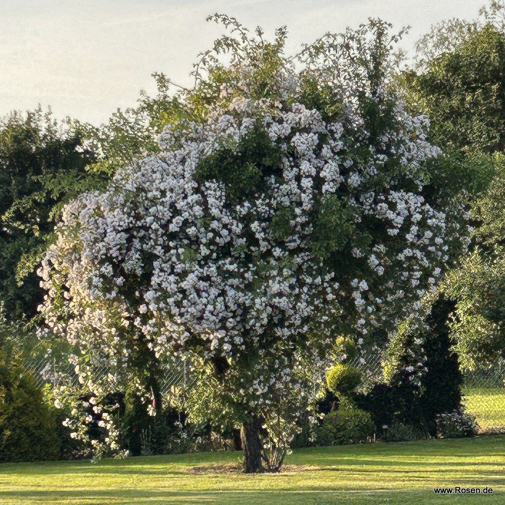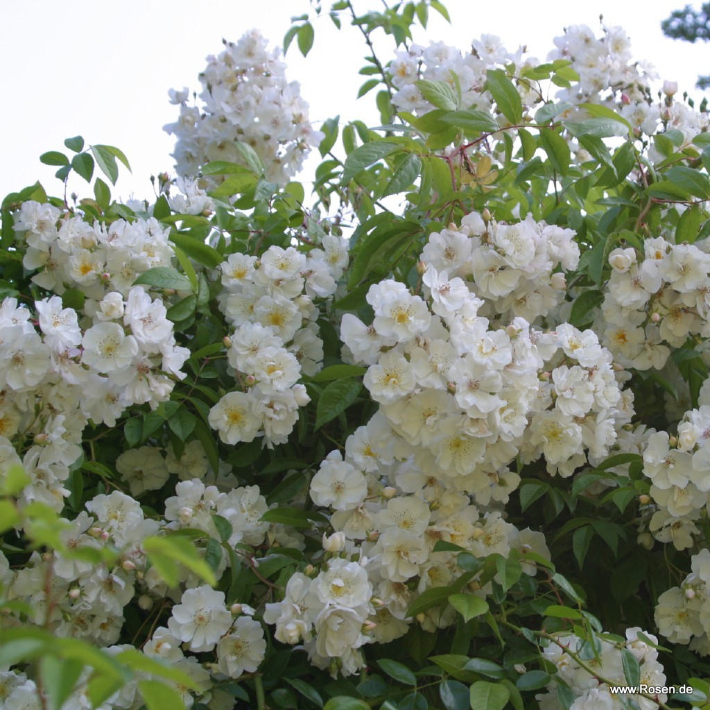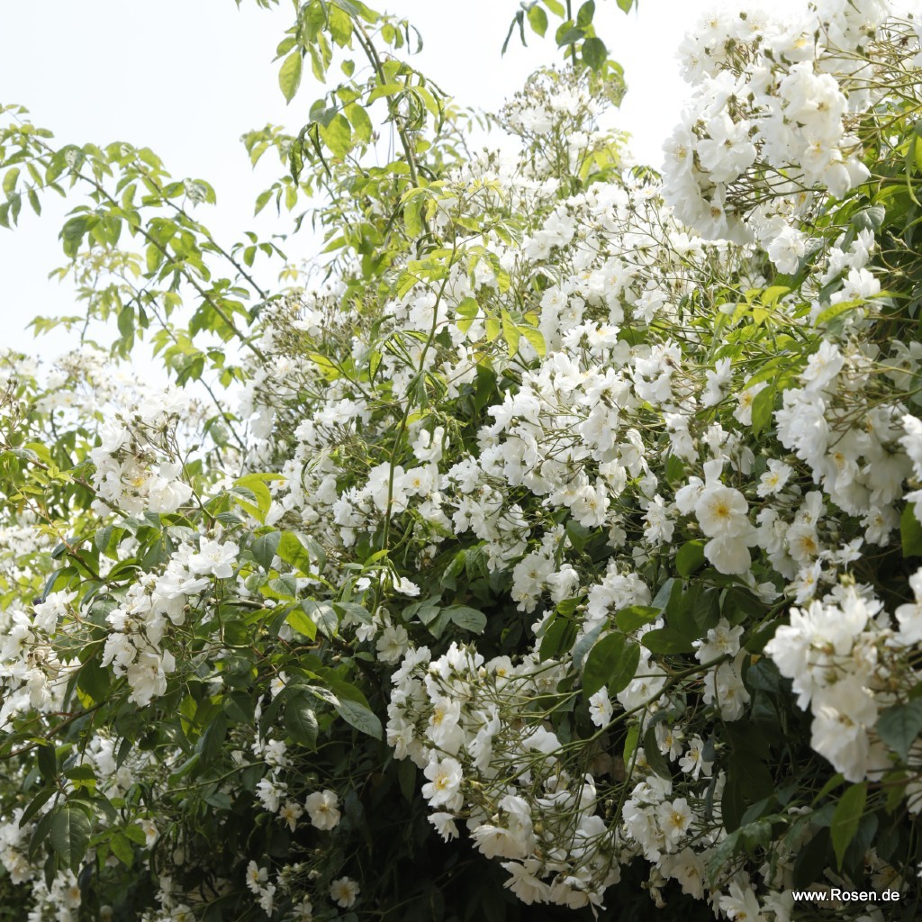 Bobbie James ist als robuster Rambler bekannt und erblüht nur einmal im Jahr, entschädigt aber mit überreicher Blütenfülle. Wie Schneebälle leuchten die dichten weißen Blütenbuschel in der Sonne.