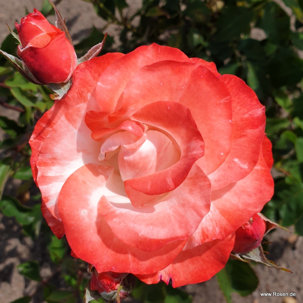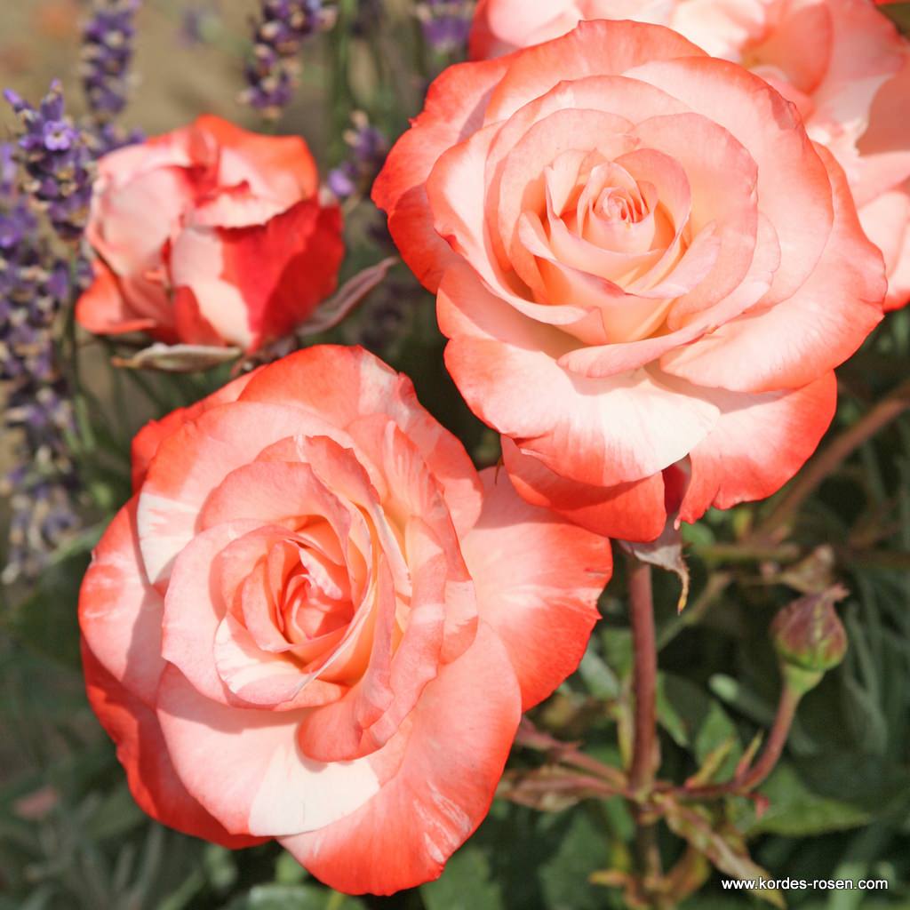 Die aufrecht wachsende Strauchrose Auf die Freundschaft hat elegant geformte und wunderschöne, zweifarbige Blüten.