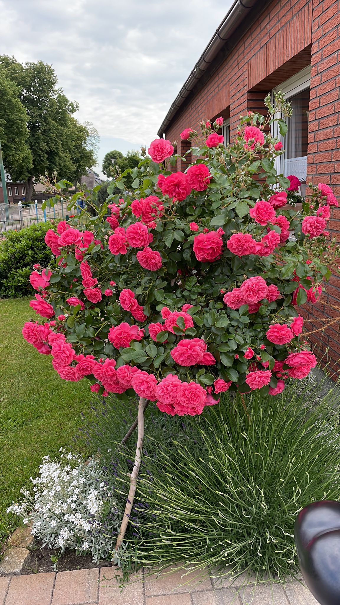Habe die Rose vor einem Jahr als Hochstamm 0,80 m gekauft. Schon im ersten Jahr hatte sie wunderbare Blüten mit zartem Duft. Jetzt im zweiten Jahr kommen doppelt so viele Blüten und im Sonnenschein ist es ein wunderbares Bild ... ABER jetzt nach einem leichten Regen hängen die Zweige mit den zahlreichen Blüten sehr nach unten und die Zweige drohen unter der Last der Blüten zu brechen. Sie sieht leider nicht mehr schön aus. Werde versuchen mir ein paar Stützen für die tiefhängenden Zweige zu besorgen. Ich finde, aufgrund der vielzahl der großen Blüten (bei mir ca. 10 Stück) pro Stengel ist die Rose einfach überlastet und leidet sehr im Aussehen.