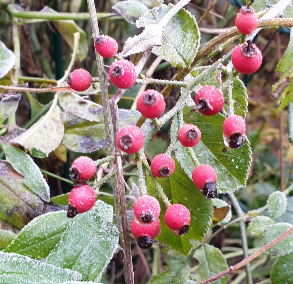 viele kleine Blüten und jede Menge Kleine Hagebutten.Wildrosencharakter! wird bei mir gut 2 Meter hoch. kann aber auch gut kleiner gehalten werden.