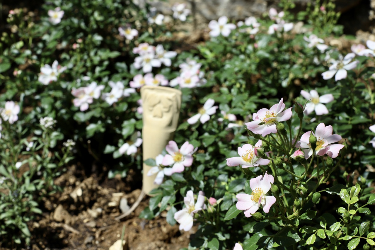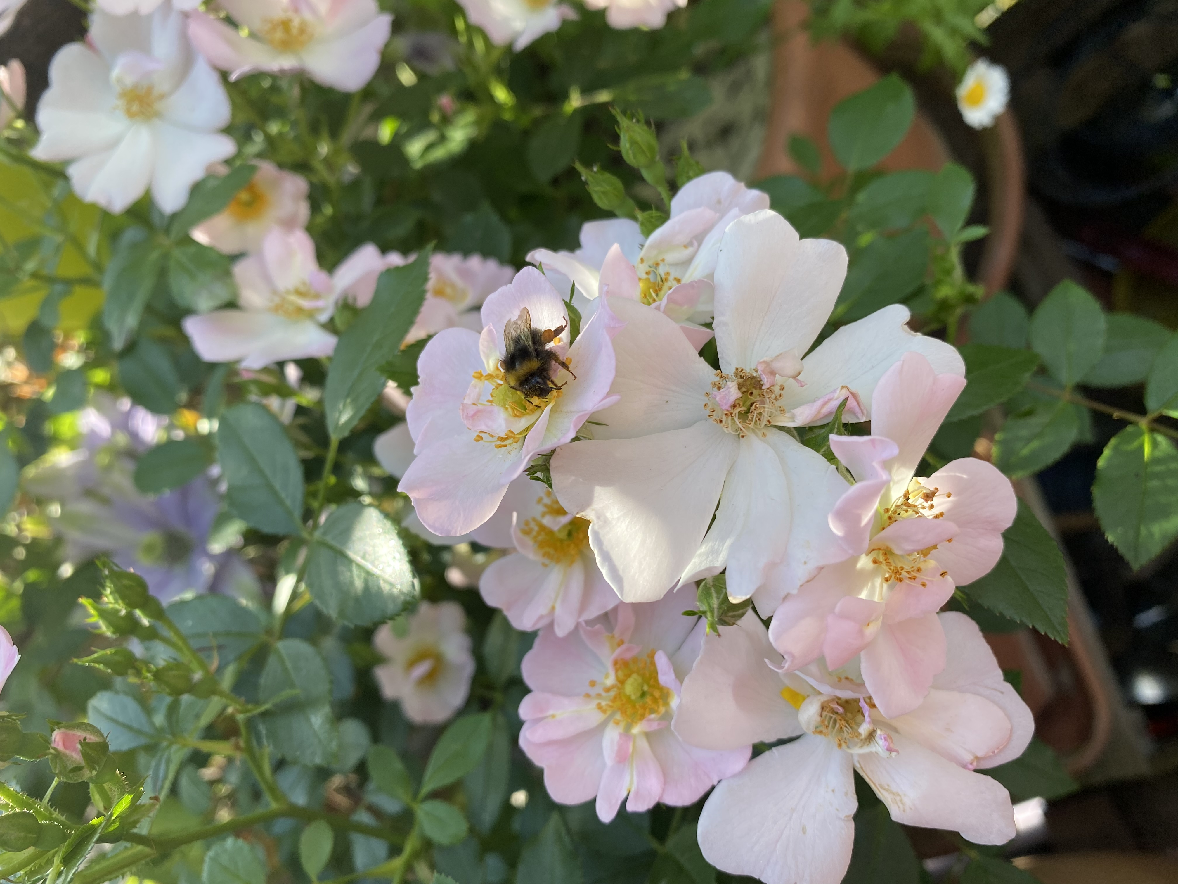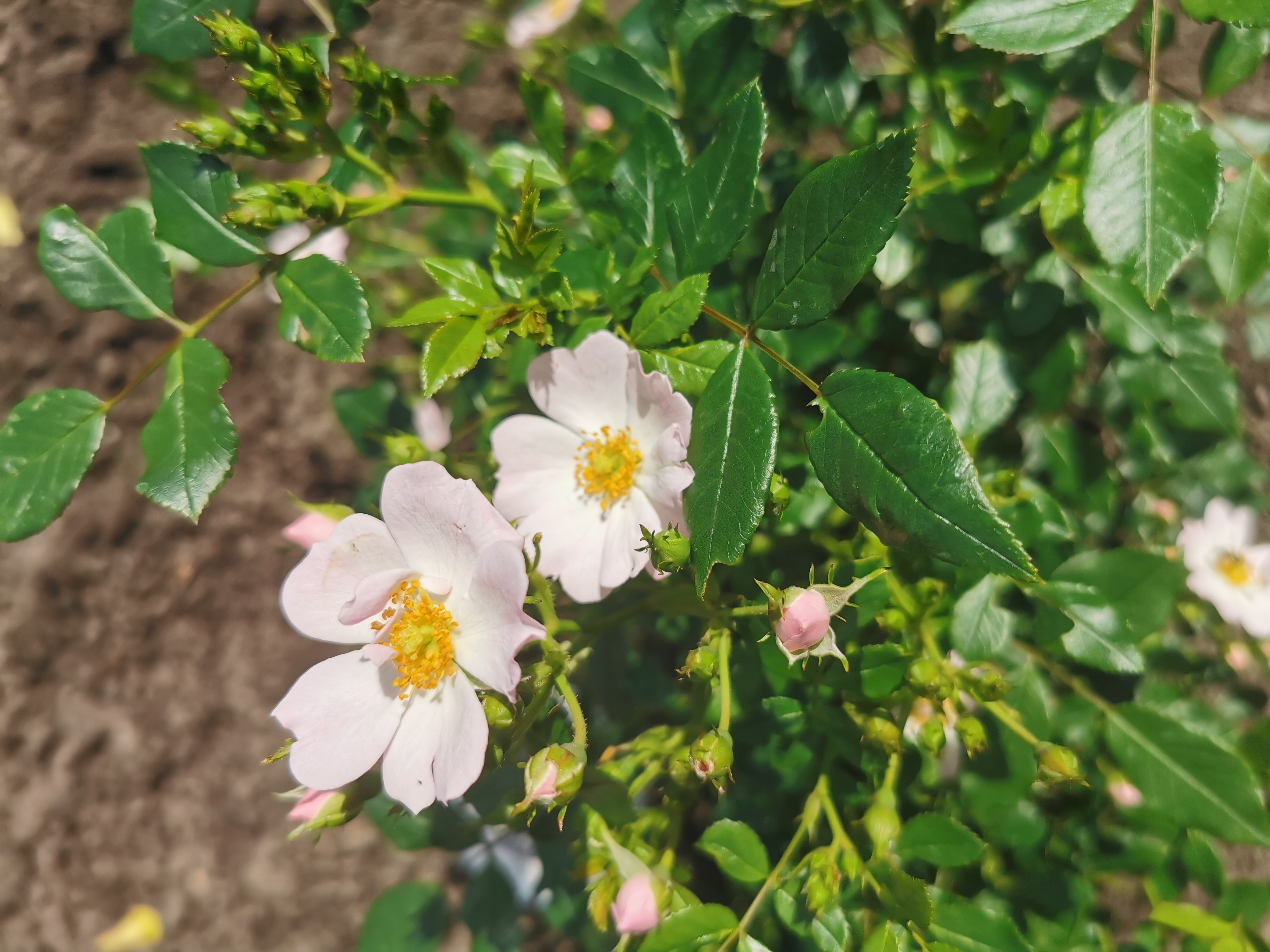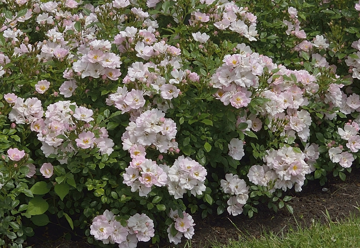 Viele, einfache und offene Blüten in zart rosa mit gelber Mitte. Ich habe sie im November wurzelnackt gepflanzt und sie hat bis zum Juni ordentlich an Größe und Breite zugelegt.