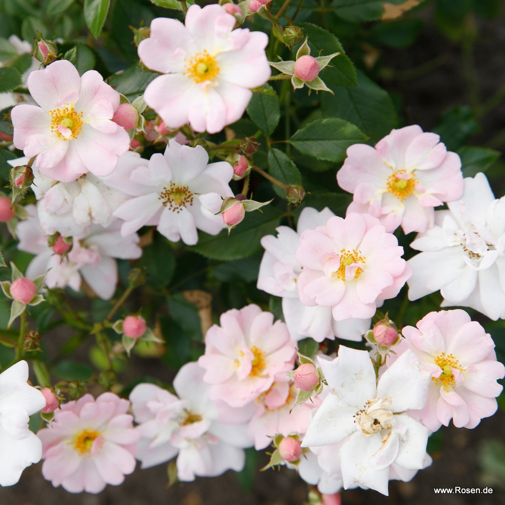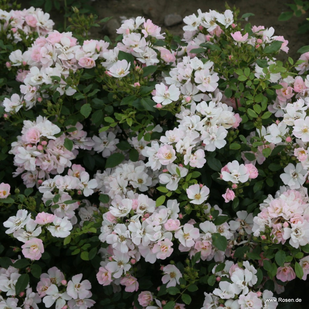 Diese Rose hat viele kleine weiße und rosa Blüten ,ist hitze beständig und reichblühend .