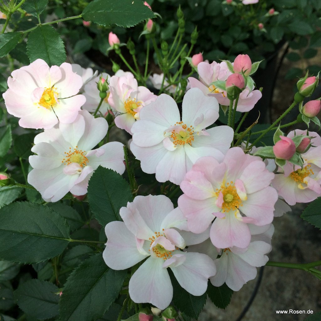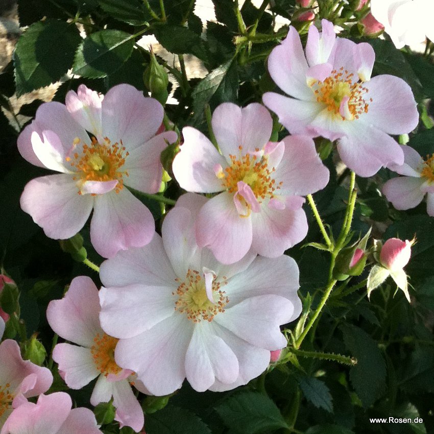 Viele, einfache und offene Blüten in zart rosa mit gelber Mitte.