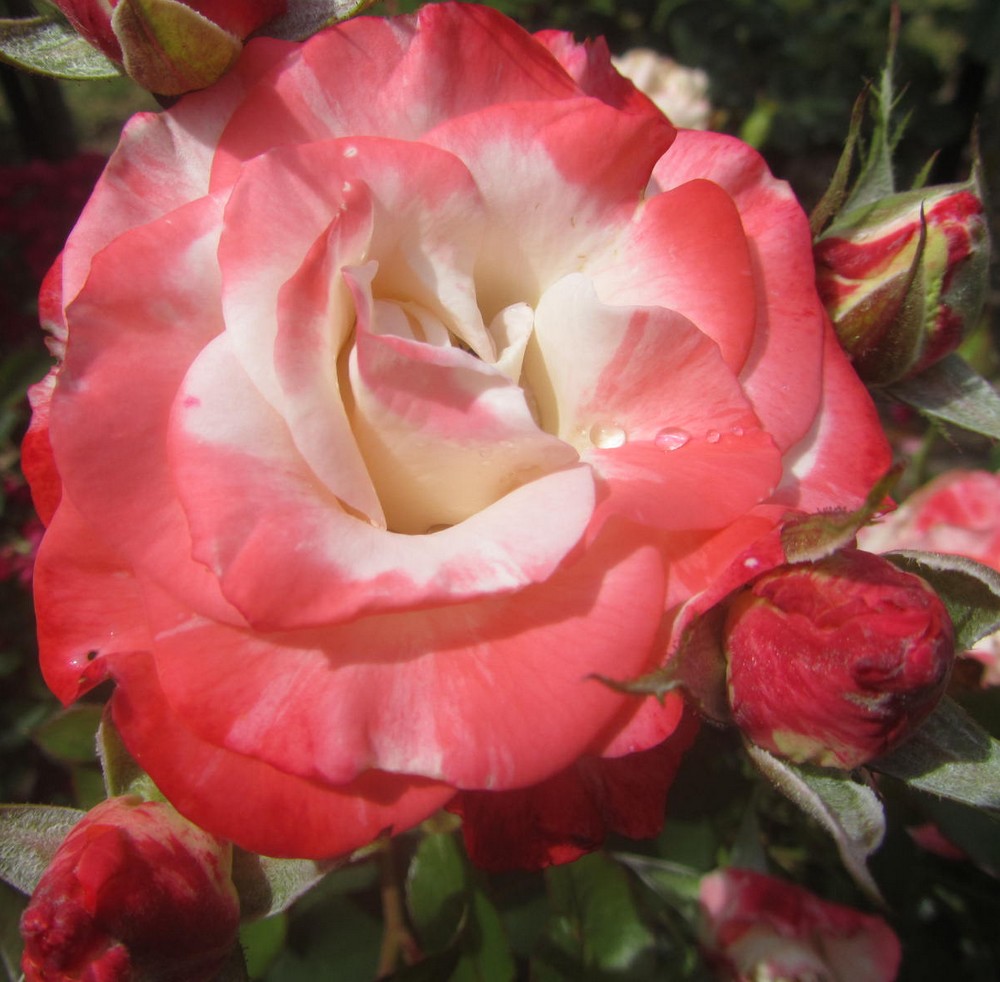 Die aufrecht wachsende Strauchrose Auf die Freundschaft hat elegant geformte und wunderschöne, zweifarbige Blüten.