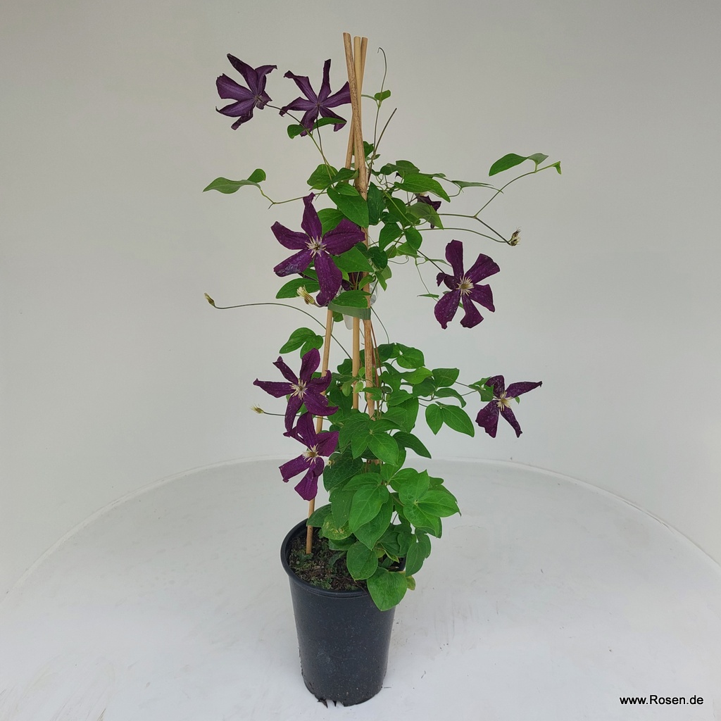 Romantische Bilder zeichnen Sie mit dieser Clematis und dazu passenden Rosenblüten. Sagenhafte Sorte mit großen violettfarbenen Blüten in großer Fülle. Bei sonnig bis halbschattigen Standort, erreicht sie eine Höhe von bis zu 300 cm.