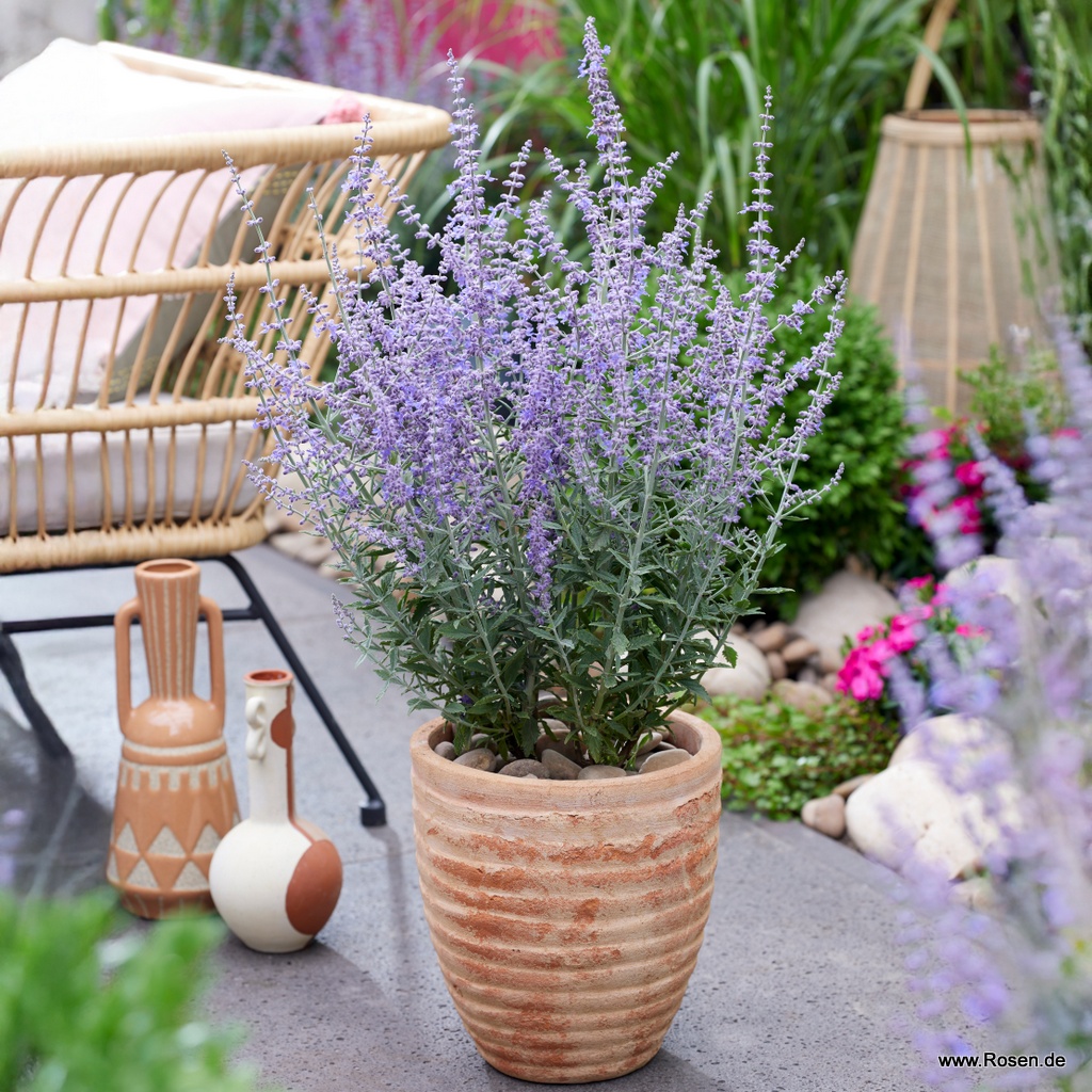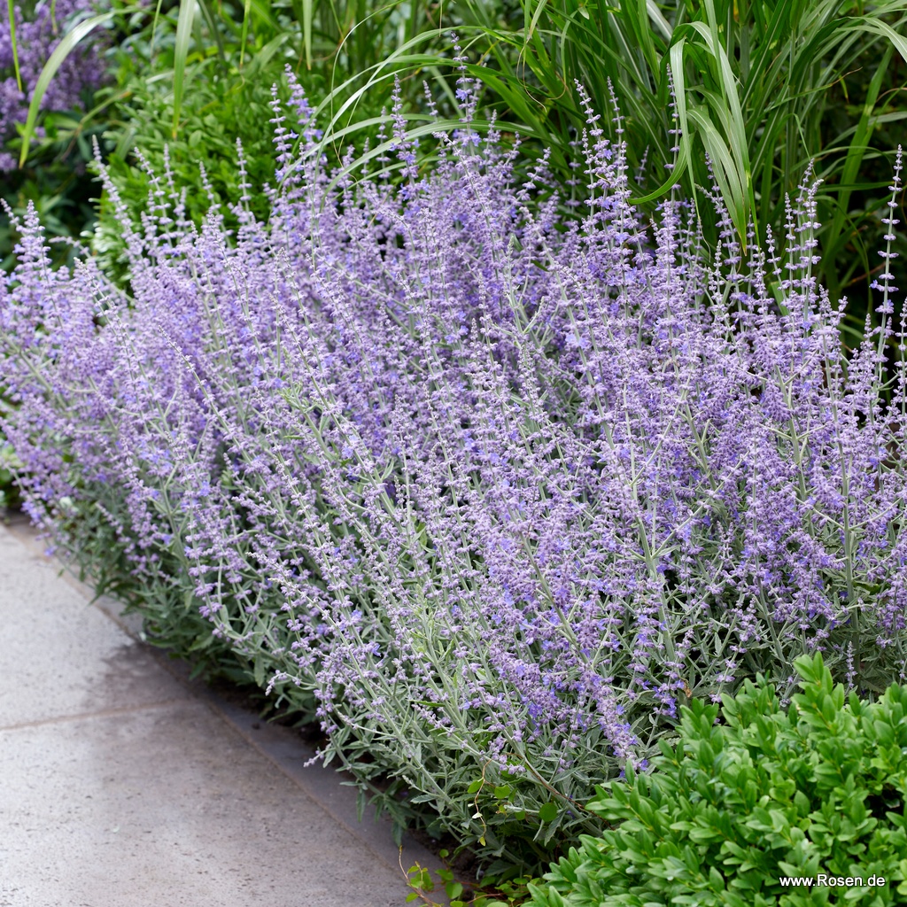 Die Blauraute 'Prime Time' ist ein wahres Highlight im Garten, denn sie ist nicht nur für den Betrachter ein toller Blickfang mit ihren lavendelblauen Blüten und den stabilen Trieben, die während der gesamten Vegetationsperiode nicht überhängen oder umknicken, sondern auch ein echter Bienenmagnet. Mit ihrem straff-aufrechten Wuchs erreicht sie eine Höhe von bis zu 90 cm und ist dabei dicht verzweigt. Perovskia atriplicifolia 'Prime Time' ist salztolerant, eignet sich besonders für sonnige und trockene Lagen und kann auch in Kübel gepflanzt werden.