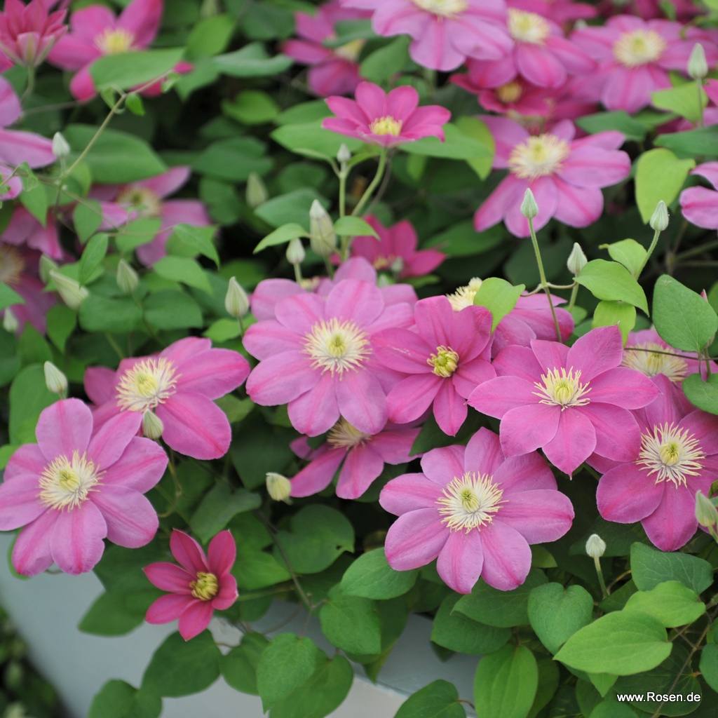 Die Clematis 'Alaina' ist ein reichblühender Kletterstrauch, der zweimal im Jahr blüht. Von Mai bis Juni zeigt sie ihre ersten rosafarbenen Blüten und nach einer Sommerpause blüht sie von Juli bis September. Die Blüten erreichen eine Größe von bis zu 17 cm und wirken exotisch und sind ein eindrucksvoller Blickfang. Die Clematis Alaina erreicht eine Höhe von 80 bis 120 cm und benötigt durch ihren kletternden Wuchs eine Rankhilfe. Sie eignet sich allerdings durch ihre Größe auch hervorragend für kleine Gärten oder in Kübeln auf Balkon und Terrasse. Diese Pflanze liebt einen Standort in der Sonne oder im Halbschatten und bildet traumhafte Partenschaften mit Kletterrosen.