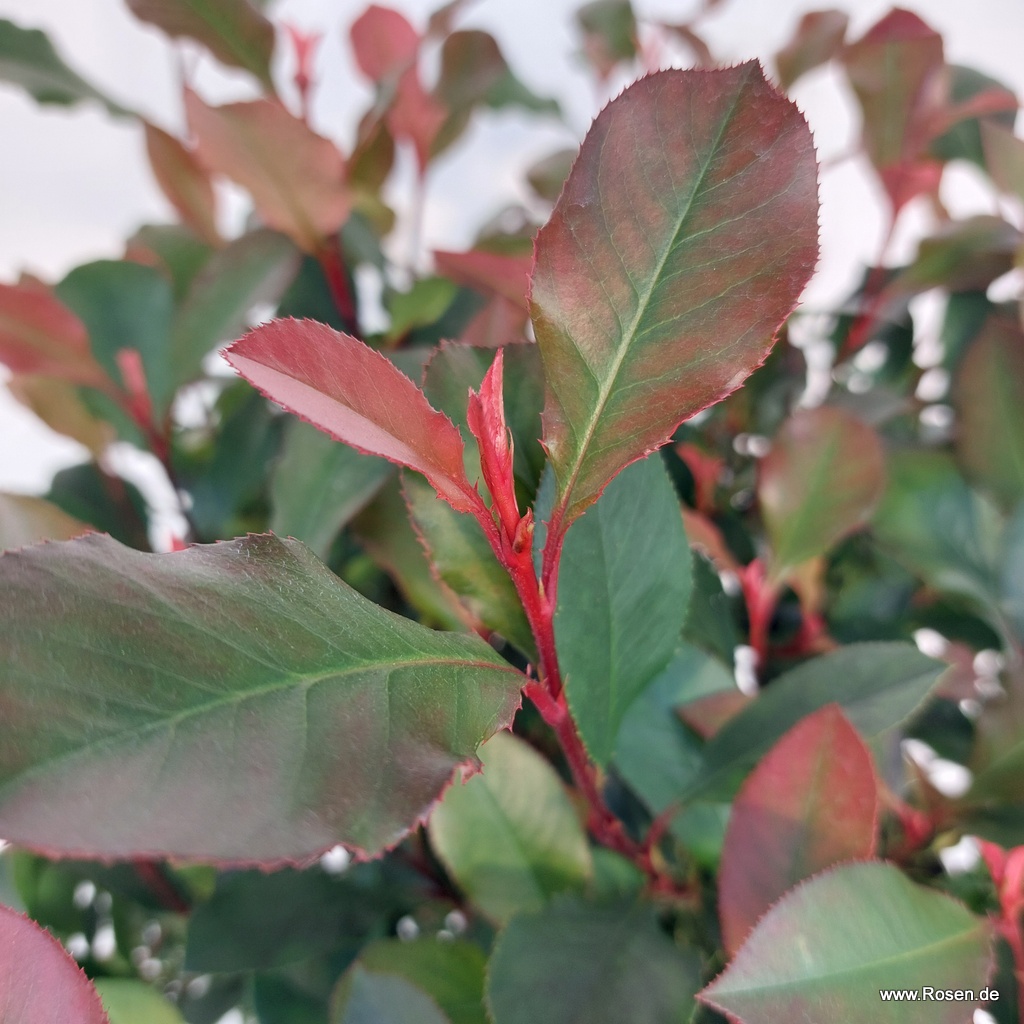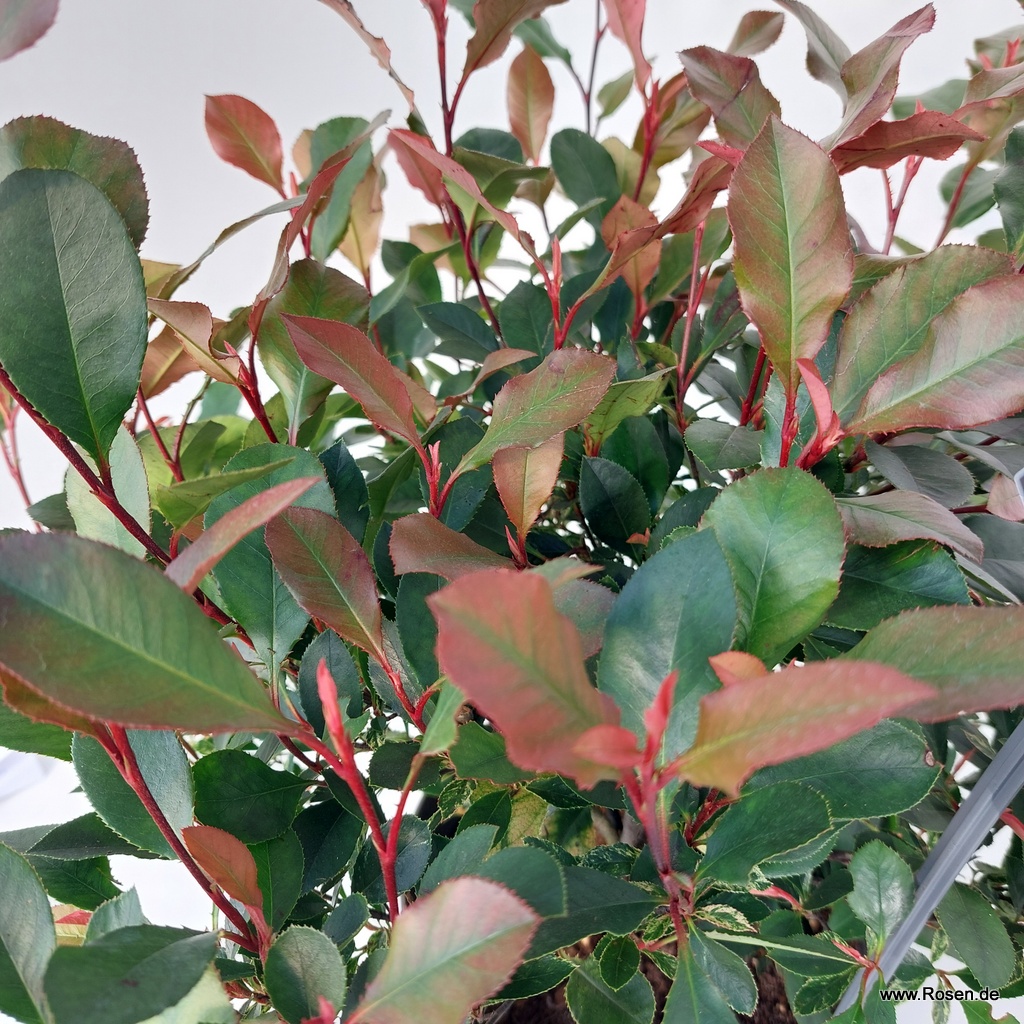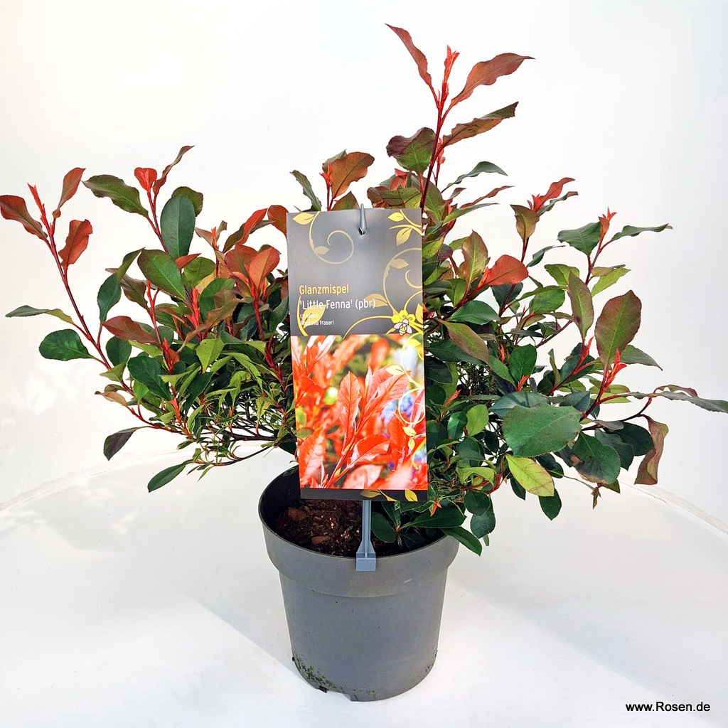 Die winterharte Glanzmispel 'Little Fenna' ist ein immergrüner Zierstrauch, der im Frühjahr mit seinen bezaubernden neuen Trieben in einem hellen Rosa begeistert, die einen wunderschönen Kontrast zu den dunkelgrünen, älteren Blättern bilden. Besonders hervorzuheben ist der dichte und gut verzweigte Wuchs von Photinia x fraseri 'Little Fenna'. Von April bis Mai erscheinen die weißen, einfachen Blüten, die eine wertvolle Nahrungsquelle für Bienen und andere Insekten bieten. Ein fruchtbarer, gut durchlässiger Boden an einem sonnigen bis halbschattigen Standort erweist sich als ideal für diese Glanzmispel, die eine Höhe von 75 bis 90 cm erreicht. Auch in einem Kübel ist sie ein wunderbarer Anblick und verschönert Balkone und Terrassen. Sogar als niedrige Hecke ist dieses dekorative Schmuckstück ein echter Hingucker.