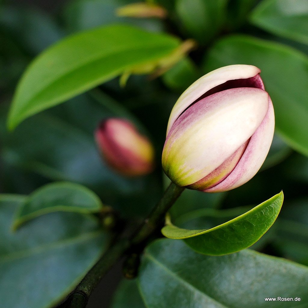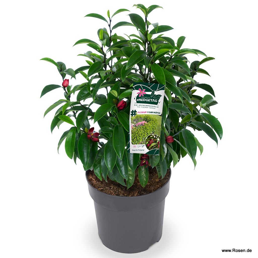 Die Heckenmagnolie ‚Hedgetag‘ (Magnolia figo) ist eine moderne Magnolien-Neuheit mit kompakter, dicht verzweigter Wuchsform. Sie erreicht etwa 2–3 m Höhe und Breite und eignet sich ideal als immergrüne Hecke oder Solitär. Ihr glänzend grünes Laub sorgt ganzjährig für Struktur und Sichtschutz. Im Frühjahr schmücken rosafarbene, tulpenförmige Blüten den Strauch, oft gefolgt von einer zweiten Blüte im Sommer. Robust, winterhart und pflegeleicht.