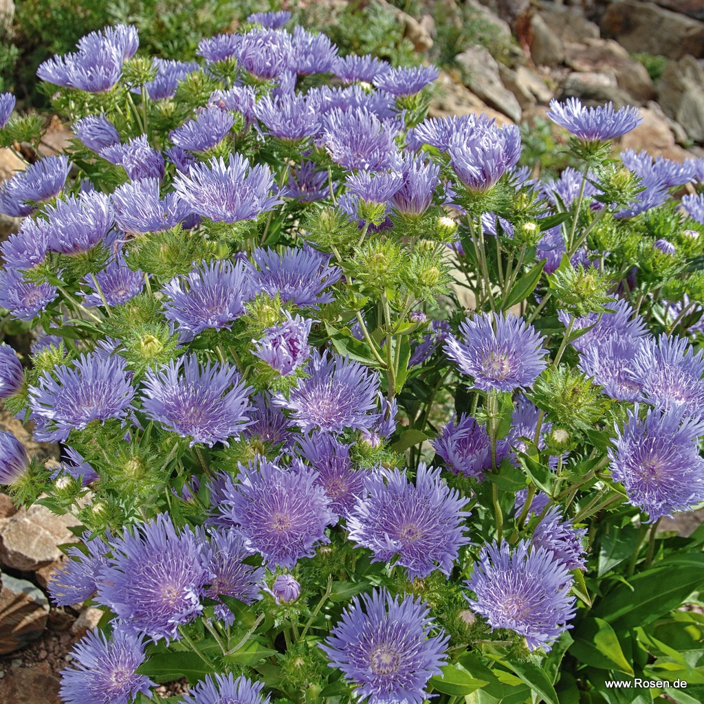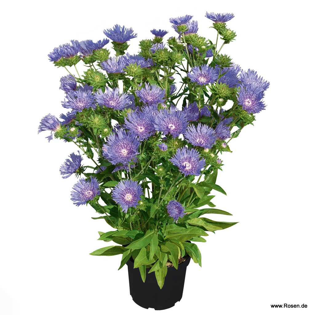 Die Kornblumenaster Peachie's Pick verdankt ihren Namen ihrer der Kornblume ähnlichen Körbchenblüten, die in beeindruckender Fülle in strahlendem Lavendelblau von Juli bis Oktober alle Blicke auf sich ziehen. Stokesia laevis Peachie's Pick eignet sich hervorragend für den Vasenschnitt und als Trockenblume. Die Staude wächst – bevorzugt an sonnigen Standorten, z. B. im Steingarten, und in locker-durchlässigem und eher feuchtem Boden – kompakt und breit aufrecht bis zu einer Wuchshöhe von bis zu 30 cm. Auch zur Kübelbepflanzung empfiehlt sich der robuste Dauerblüher.