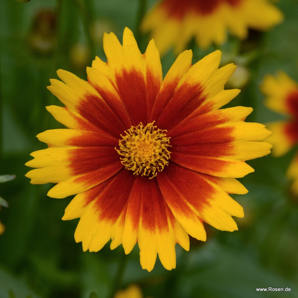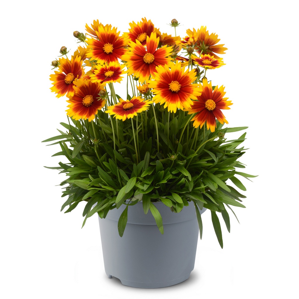 Das Mädchenauge Coreopsis grandiflora ‘UpTick™ Gold & Bronze’ ist eine kompakte, reichblühende Staude mit auffälligen, margeritenähnlichen Blüten. Von Juni bis September, oft sogar bis zum ersten Frost, erscheinen zahlreiche goldgelbe Blüten mit einem kontrastreichen bronzeroten Zentrum. Die einzelnen Blüten erreichen etwa 4 bis 7 cm Durchmesser und sorgen über viele Wochen hinweg für lebendige Farbakzente im Garten.