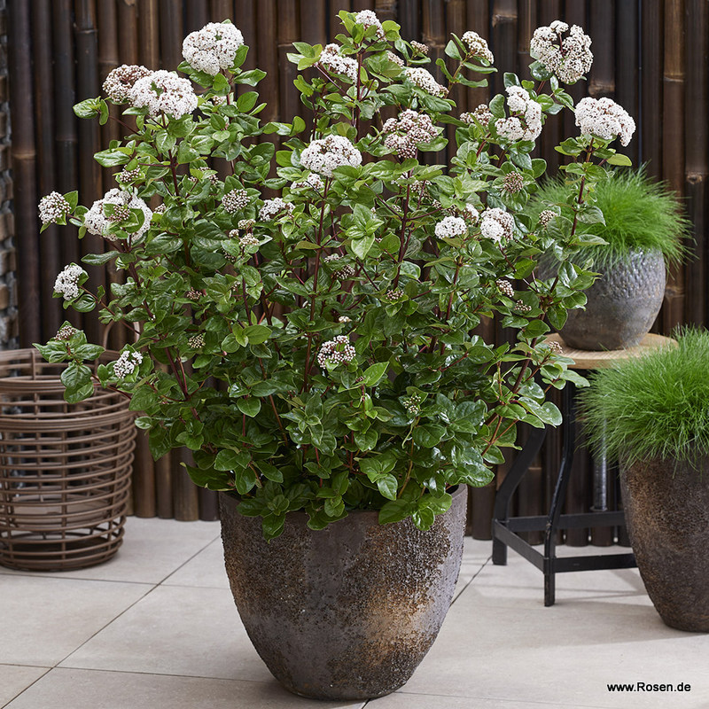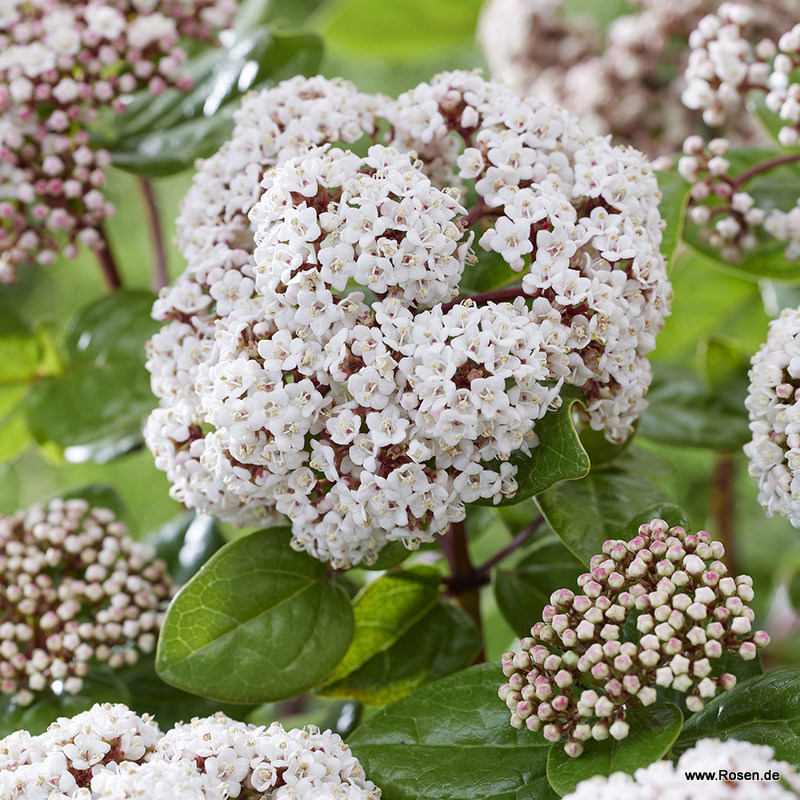 Der Mittelmeerschneeball Mittelmeerschneeball 'Ladybird' ist ein immergrünes Laubgehölz, das das ganze Jahr über interessante Akzente im Garten setzt: im Frühjahr mit seiner bezaubernden weiß-rosa Blütenpracht mit angenehmen Duft, im Sommer mit seinem dekorativen Fruchtschmuck und im Winter mit seinen gesunden, glänzenden Blättern. Viburnum tinus Mittelmeerschneeball 'Ladybird' ist mit seiner Wuchshöhe von ca. 120 cm ein tolles Highlight im Beet und noch dazu insektenfreundlich, denn die dunkelvioletten Beeren sind bei Vögeln äußerst beliebt. Dieser Mittelmeerschneeball ist hitzebeständig und fordert nur einen geringen Pflegeaufwand. Der Standort der bis zu -15° Grad winterharten Pflanze sollte sonnig bis halbschattig sein.