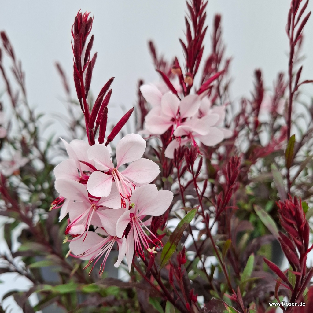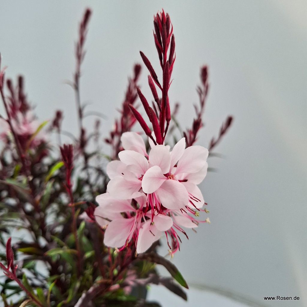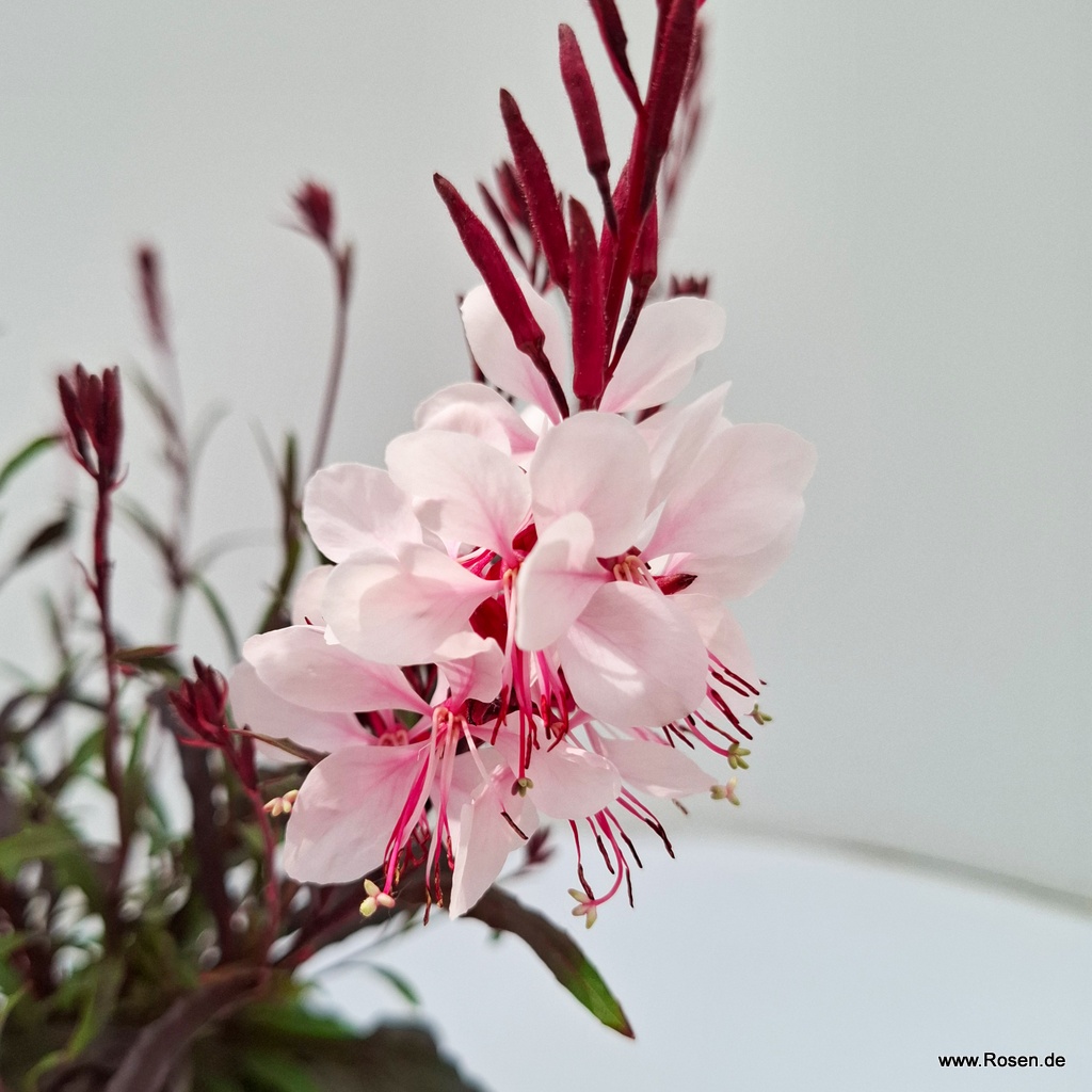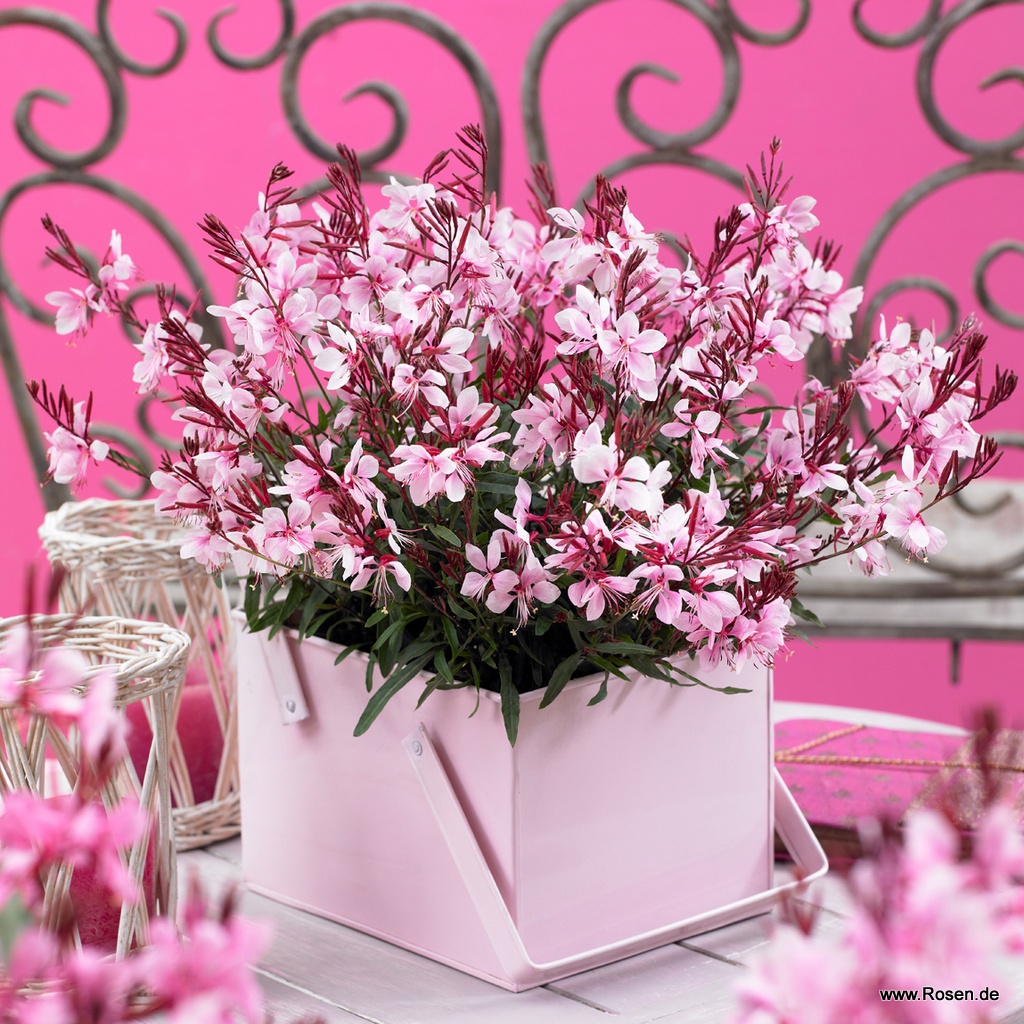 Die Prachtkerze 'Gaudi Pink' ist eine mehrjährige Staude, die zwischen Juli und Oktober ihre pinkfarbenen, in Rispen angeordneten Blüten über dem sommergrünen Laub präsentiert. Der bevorzugte Standort für Gaura lindheimeri 'Gaudi Pink' ist eine sonnige Lage, z. B. im Stein- oder Rosengarten, mit durchlässigem und sandigem Gartenboden. Die Prachtkerze wächst aufrecht und locker und erreicht eine Wuchshöhe von bis zu 50 cm. In der kalten Jahreszeit ist ein Winterschutz ratsam.