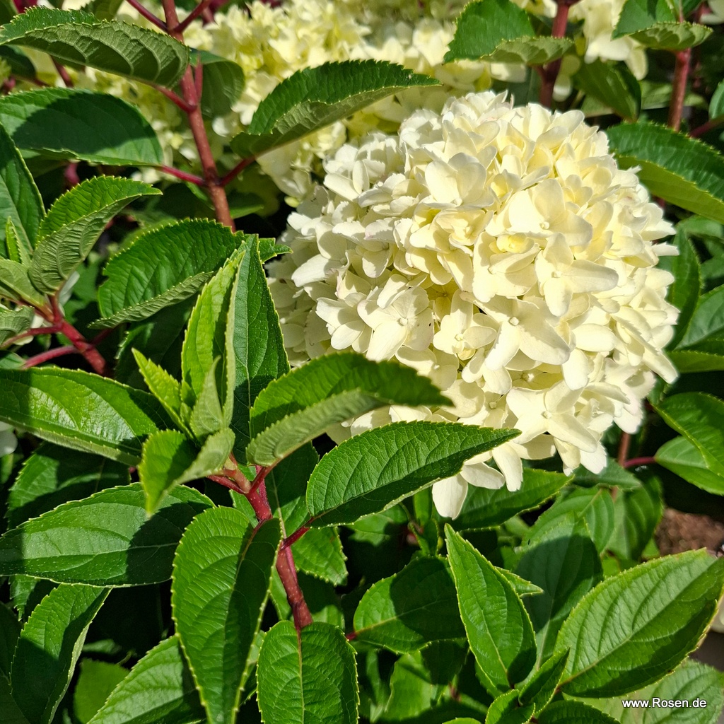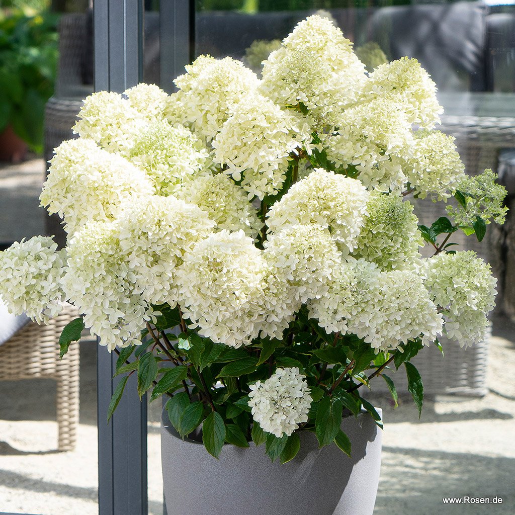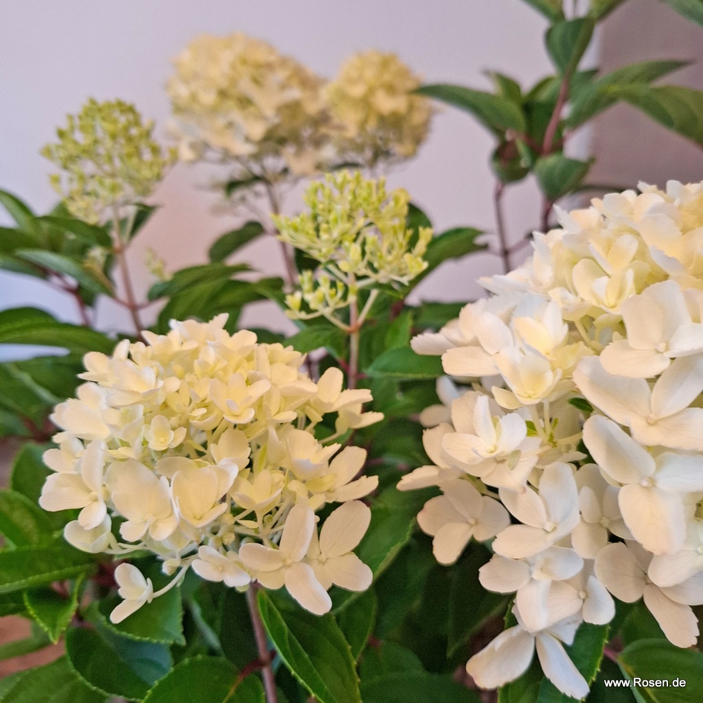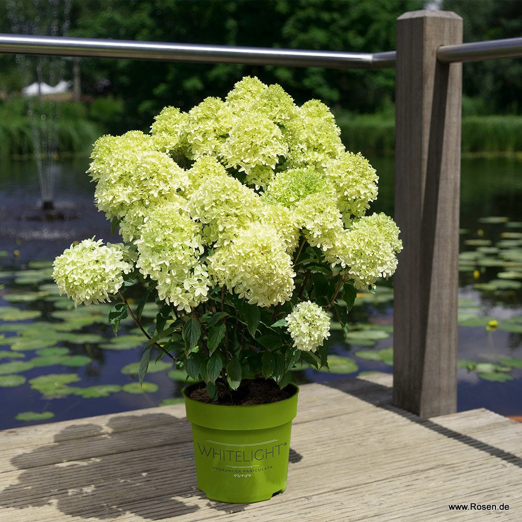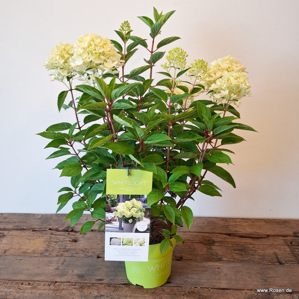 Die Rispenhortensie 'Whitelight' ® zeigt cremeweiße Blüten, die wie warmweißes Licht wirken. Der sommergrüne Strauch ist winterhart, pflegeleicht und schnittverträglich. Die Blüten verströmen von Juli bis September einen zarten Duft. Die großen Rispen ziehen zahlreiche Insekten an. Für einen optimalen Wuchs braucht die Rispenhortensie 'Whitelight' ® einen sonnigen bis halbschattigen Standort, nährstoffreichen und gut durchlässigen Boden. Sie ist für Garten, Kübel, Balkon oder Terrasse ideal geeignet. Ausreichende Bewässerung ist besonders während der Blütezeit wichtig, Staunässe sollte aber vermieden werden. Ein Rückschnitt im Frühjahr fördert neue Triebe und Blüten im Sommer. Die Pflanze wächst kompakt und erreicht 120 bis 180 cm Höhe und 120 bis 150 cm Breite.
