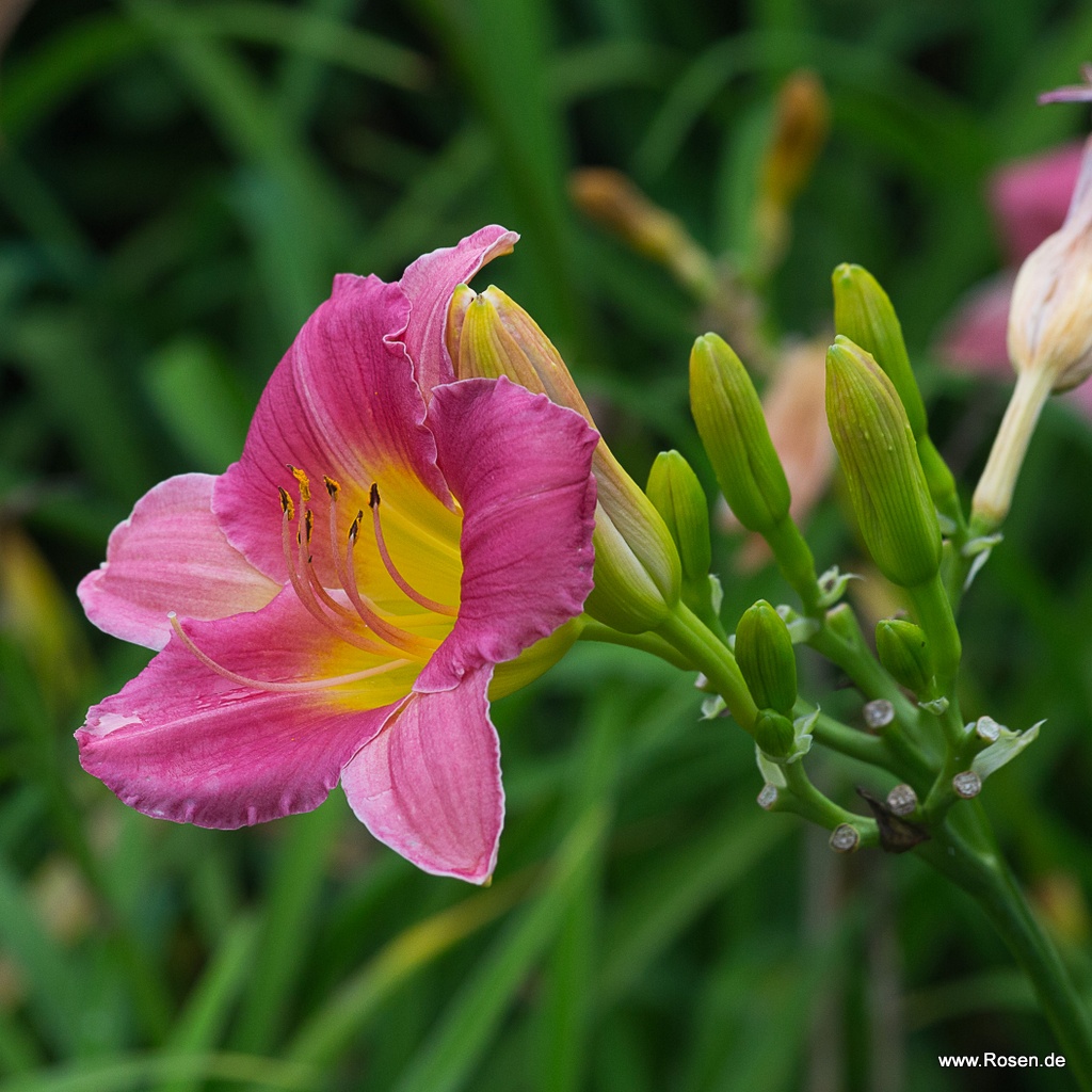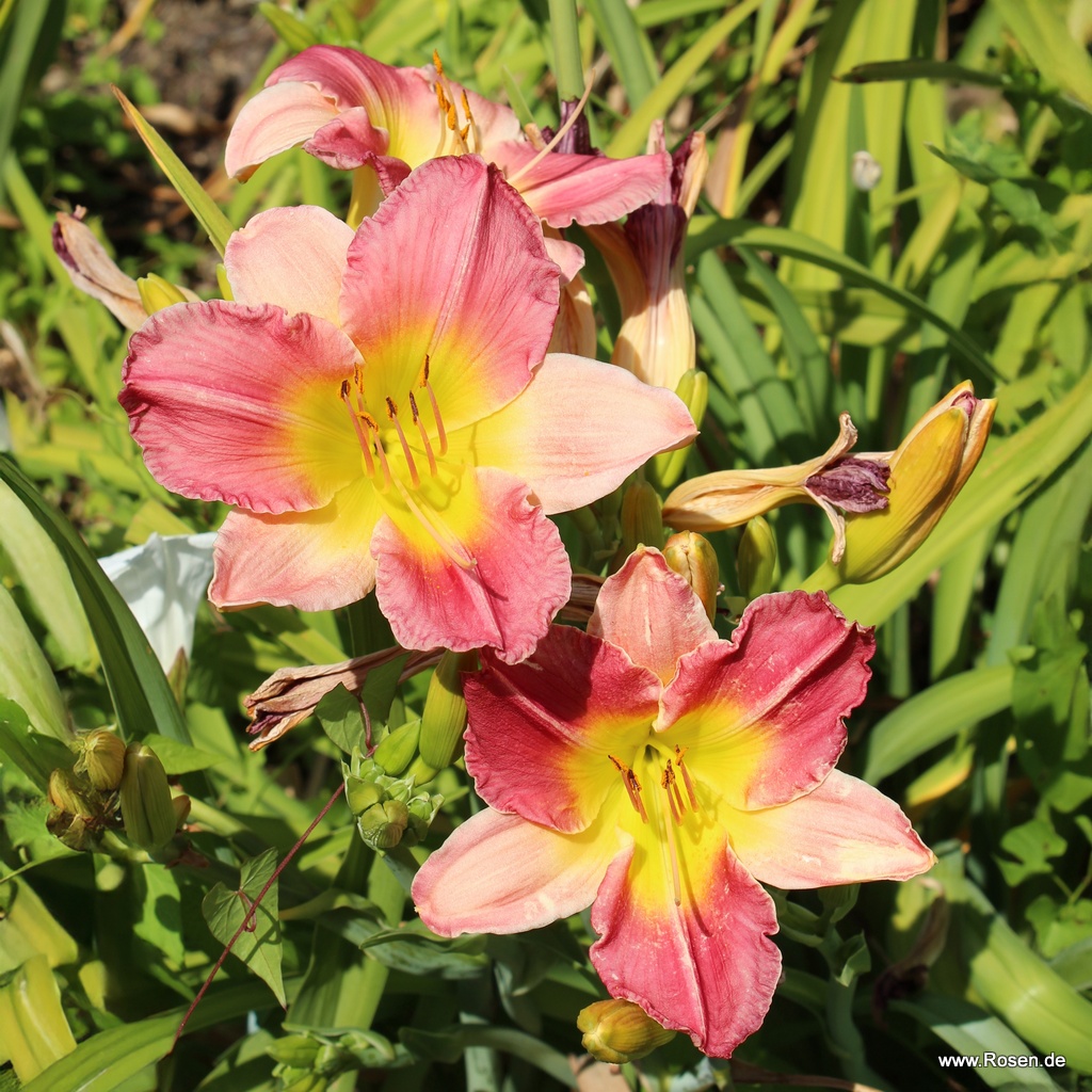 Bereichern Sie Ihren Garten mit 'Final Touch' um eine ganz besondere Taglilien-Sorte, denn die drei inneren Blütenblätter sind tief rosa gefärbt, während die drei äußeren hellrosa sind. Die Blüten haben eine intensiv grün-gelb gefärbte Mitte, in der die Blütenstempel sitzen. Wie der Name schon andeutet, blühen die einzelnen Blüten bei allen Taglilienarten, einschließlich 'Final Touch', meist nur einen Tag lang. Diese spät blühende Sorte kann jedoch bei optimaler Pflege und guten Bodenverhältnissen zweimal im Jahr (August/September) blühen. Hemerocallis x cultorum 'Final Touch' benötigt einen durchlässigen, frischen Gartenboden sowie einen sonnigen Standort. Es ist ratsam, ihr (z. B. im Staudenbeet, am Wegesrand oder am Teichrand) ausreichend Platz zu geben, da der Blatthorst mit der Zeit eine recht stattliche Höhe und Breite von jeweils bis zu 80 cm erreicht.